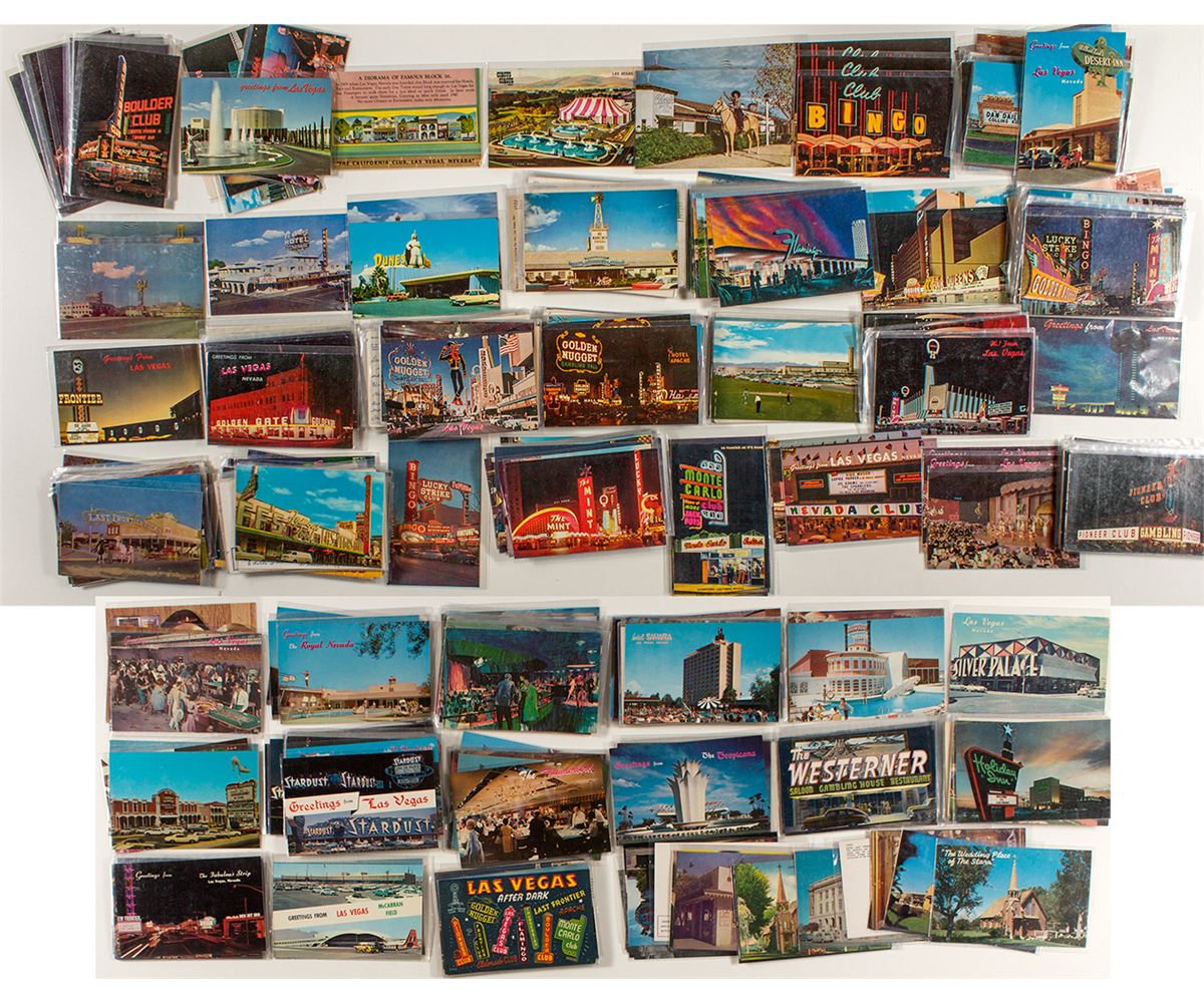 Las Vegas, Nevada has become one of the most popular tourist destinations in the world. Films, T.V. Shows, and celebrities have made Sin City the perfect backdrop to sensationalized stories and tails. According to the Las Vegas Convention and Visitors Authority, the city had nearly 40 million people visited the city in 2013, pumping over $9 billion Clark County's economy. Yet the gaming and entertaining Mecca we have come to know today, had a rather humble beginning. The city of Las Vegas sprung up from the Nevada desert to become an economic and agricultural marvel. It is difficult to imagine the Las Vegas we all have come to know to look anything different than it does today Las Vegas has made a remarkable transformation in the past 75 years. In 1940, the city boasted a humble population of only 8,422 people. Projects like the Hoover Dam helped bring people to the area, but the first clue Las Vegas' potential as the new hotspot for resorts and casinos came about in 1941, with the opening of the El Rancho Vegas. By the end of the decade the city had 24,624 residents, while Clark County played home to 48,289 people. With a growing population and an increasing number of tourists to the area, casino and resort owners battled to create unique and even more luxurious resorts and casinos. Those early and smaller casinos often fell victim to the wrecking ball; destroyed to only be replaced with something new and bigger. While this practice has made Las Vegas the city that it is, it has made the historical structures a rare and forgotten site. This lot provides a look back on humble roots of Sin City. This lot has a total of 461 post cards dating from the 1950s to a few from the 1980s. Over 90% of the post cards feature Las Vegas casinos or gaming. Certainly a must have for collectors and historians! Here is the complete list of post cards and numbers; (11) Boulder Club Casino, (7) Caesar's, (1) California Club, (2) Club 21, (3) Club Bingo, (18) Desert Inn Casino, (2) Dunes Casino, (4) El Cortez Casino, (16) El Rancho Vegas, (24) Flamingo Casino, (2) Four Queens Casino, (25) Fremont Casino, (1) Frontier Casino, (13) Golden Gate Casino, (70) Golden Nugget Casino, (4) Hacienda Casino, (9) Horseshoe Casino, (1) Landmark, (19) Last Frontier, (32) Las Vegas Club, (2) Lucky Strike, (26) Mint, (3) Monte Carlo, (3) Nevada Club, (3) New Frontier, (17) Pioneer Club, (4) Riviera, (4) Royal Network, (15) Sands Casino, (19) Sahara Casino, (2) Show Boat Casino, (1) Silver Palace, (3) Silver Slipper, (20) Stardust Casino, (6) Thunder Casino, (5) Tropicana Casino, (5) Westerner Casino, (17) Las Vegas Motels, (9) Las Vegas Street Scenes, (3) Las Vegas Airport, (8) Las Vegas Gaming, and (20) Las Vegas General. (Prag Collection)