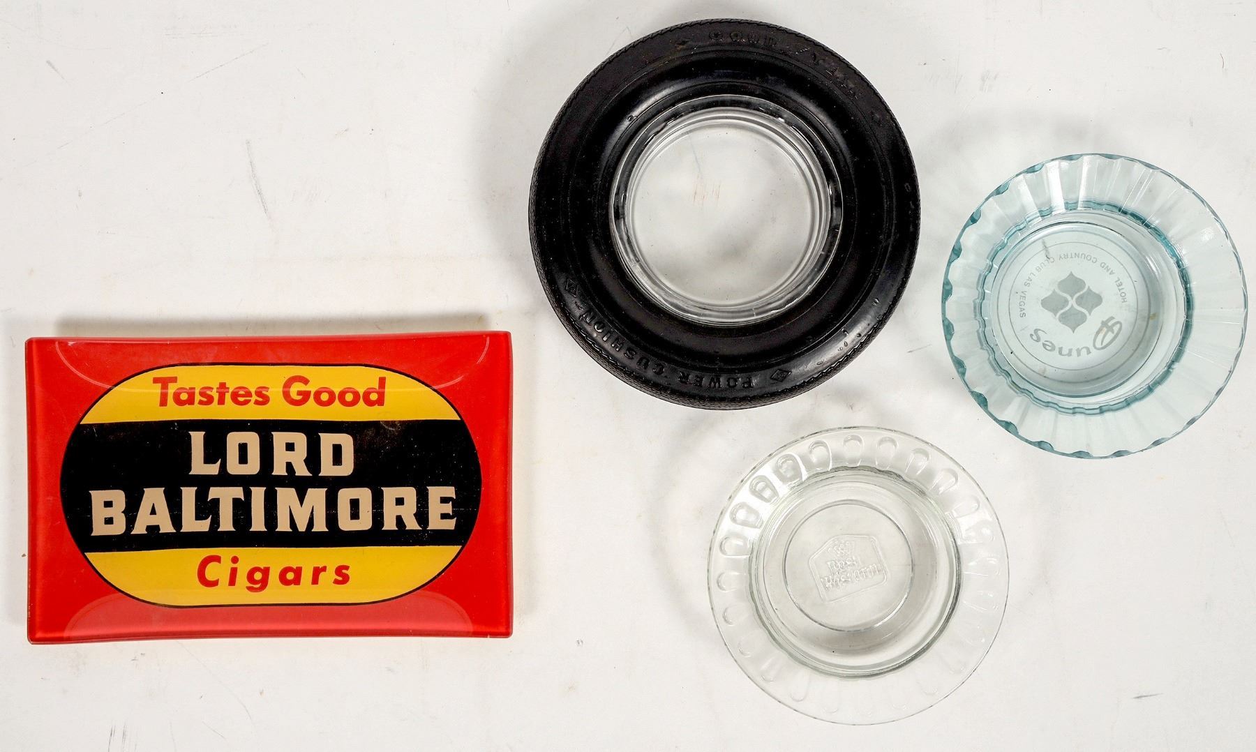 Colorful Lord Baltimore ashtray or candy dish, 4.5x7.5". Aqua Dunes Hotel, Las Vegas ashtray, 4.25". Clear Best Western ashtray, 4.25". Goodyear tire and center glass ashtray, 5.5".