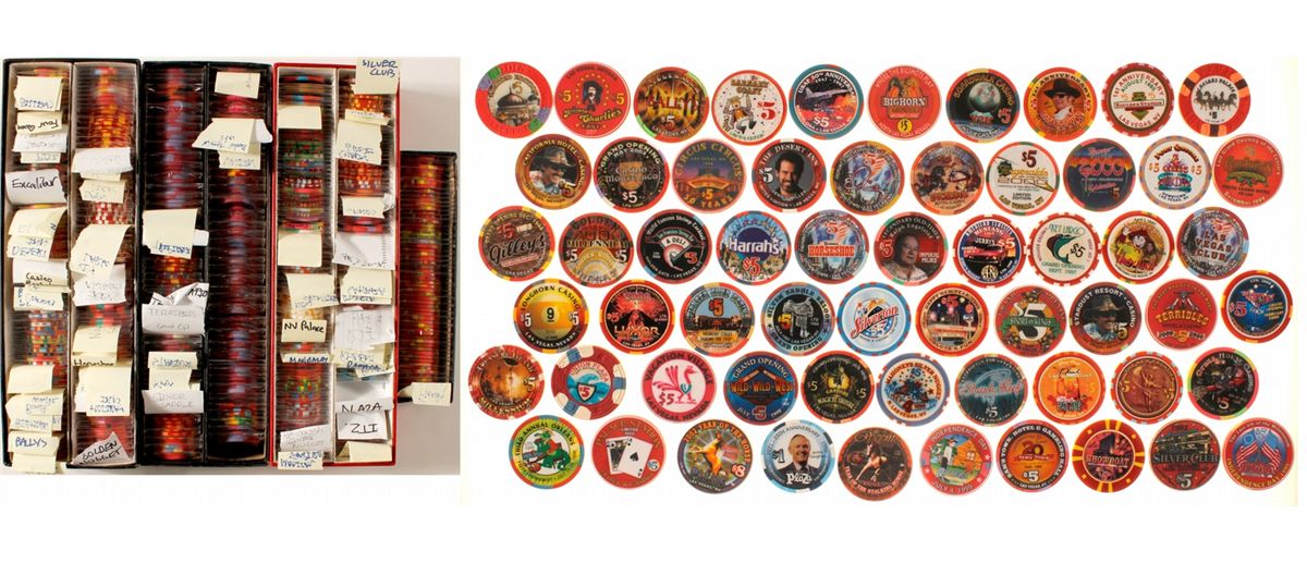A comprehensive collection of Las Vegas $5 commemorative gaming chips from many casinos, closed and currently-open. Lot of 590. Casinos include: Aladdin, AZ Charlie's, Boomtown, Circus Circus, Excalibur, Fiesta, Golden Nugget, Imperial, Key Largo, Lady Luck, Luxor, NV Palace, Opera House, Palace Station, Sahara, Sands, Treasure Island, Tropicana, West Ward Ho, and many others. Chips are commemorating events such as grand openings, anniversaries, holidays, the Millennium, Nevada history, and special events specific to casinos (such as food, poker tournaments, etc.). Too many gems in here to list!City: Las VegasCounty: ClarkState: NVDate: