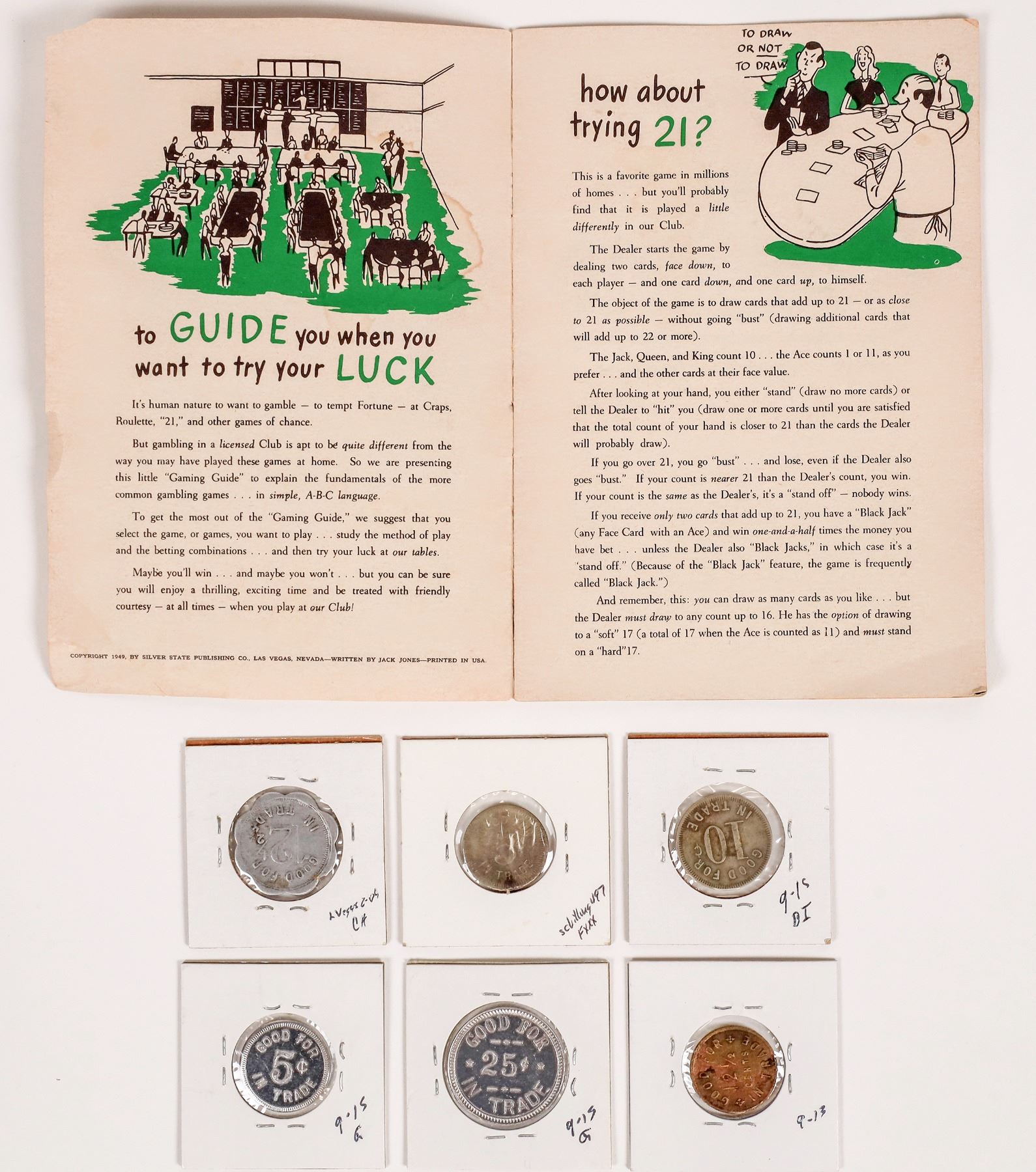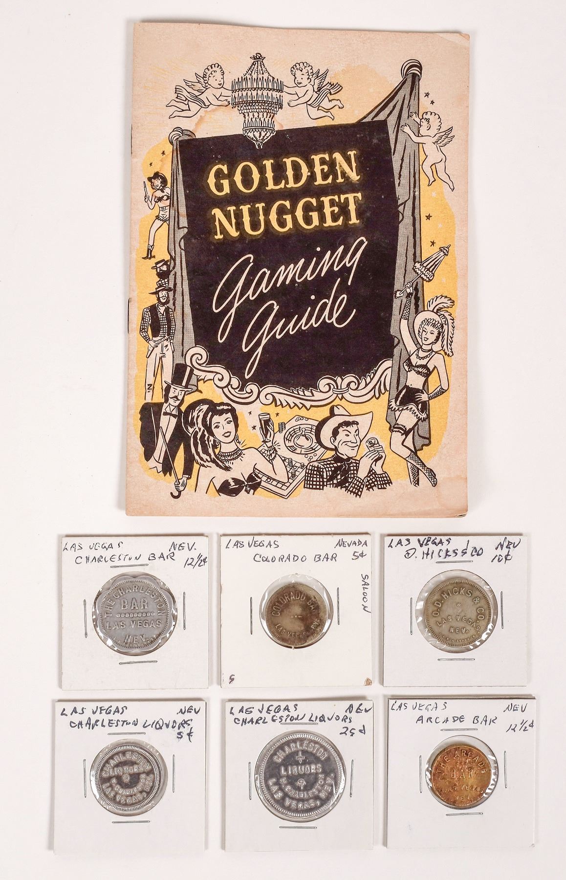 Lot of six Las Vegas tokens: Charleston Bar; Colorado Bar; D. Hicks & Co.; Arcade Bar; Charleston Liquors (2). Also a gaming guide from the Golden Nugget, downtown Las Vegas, circa 1950s.