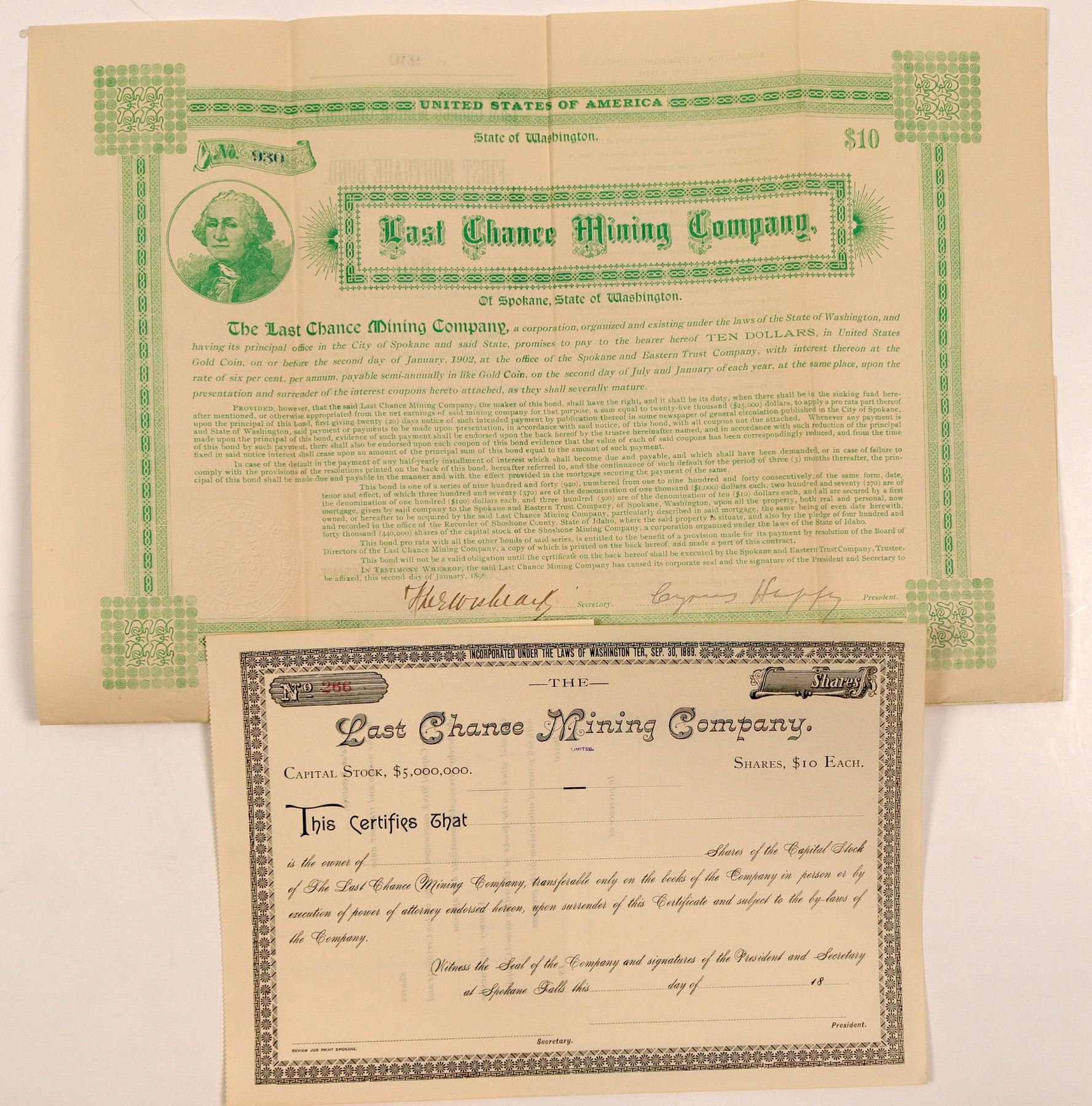 Lot of 2. 1) Bond No. 930, issued for $10, January 2nd, 1896. Signed by the president (Happy?) and the secretary. Not cancelled. Green border and print, vignette of George Washington. Eight coupons attached. 17 x 14.5" Folds, toning. Secured by 440,000 shares of the Shoshone Mining Company. 2) Unissued stock certificate. No. 266. Spokane Falls dateline. This company operated at Kellogg, Coeur d'Alene District, Shoshone County, Idaho. The Shoshone was owned by the same people. It was formed after a discovery on the 1200 ft. level of the Last Chance (outside of the Last Chance claim). They went to the surface and staked the claim (instead of the regular, opposite way). Coeur d'Alene District, Shoshone County Idaho Ken Prag Collection