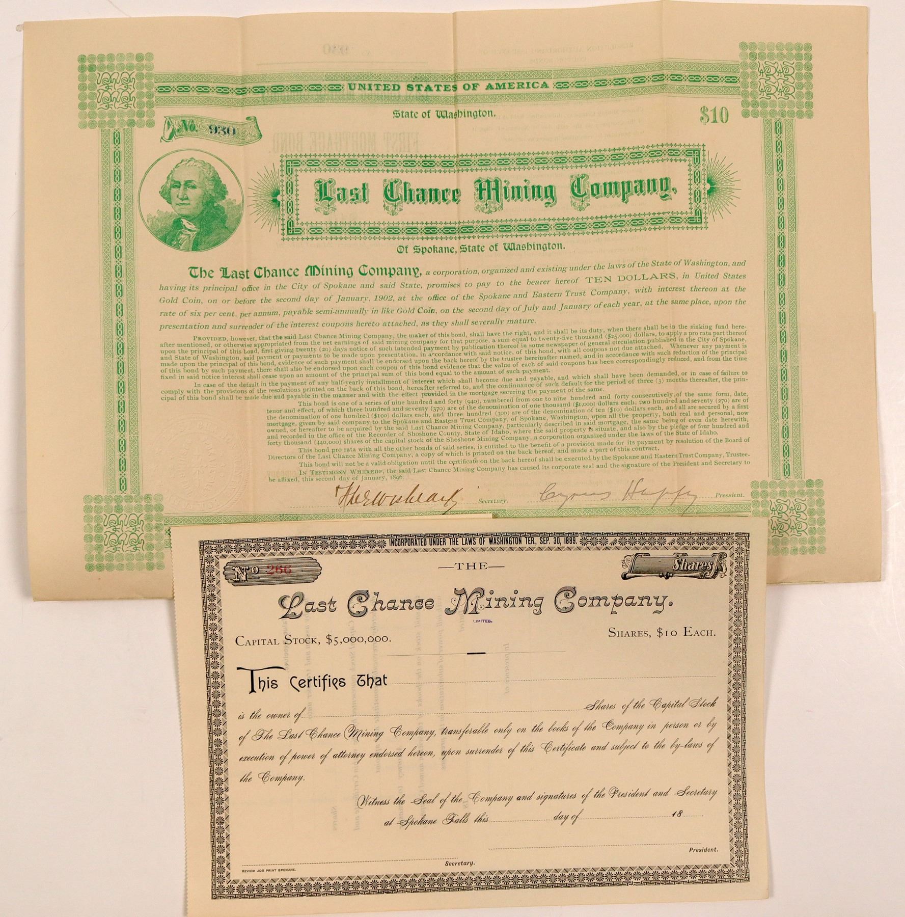 Lot of 2. 1) Bond No. 930, issued for $10, January 2nd, 1896. Signed by the president (Happy?) and the secretary. Not cancelled. Green border and print, vignette of George Washington. Eight coupons attached. 17 x 14.5" Folds, toning. Secured by 440,000 shares of the Shoshone Mining Company. 2) Unissued stock certificate. No. 266. Spokane Falls dateline. This company operated at Kellogg, Coeur d'Alene District, Shoshone County, Idaho. The Shoshone was owned by the same people. It was formed after a discovery on the 1200 ft. level of the Last Chance (outside of the Last Chance claim). They went to the surface and staked the claim (instead of the regular, opposite way). Ken Prag Collection