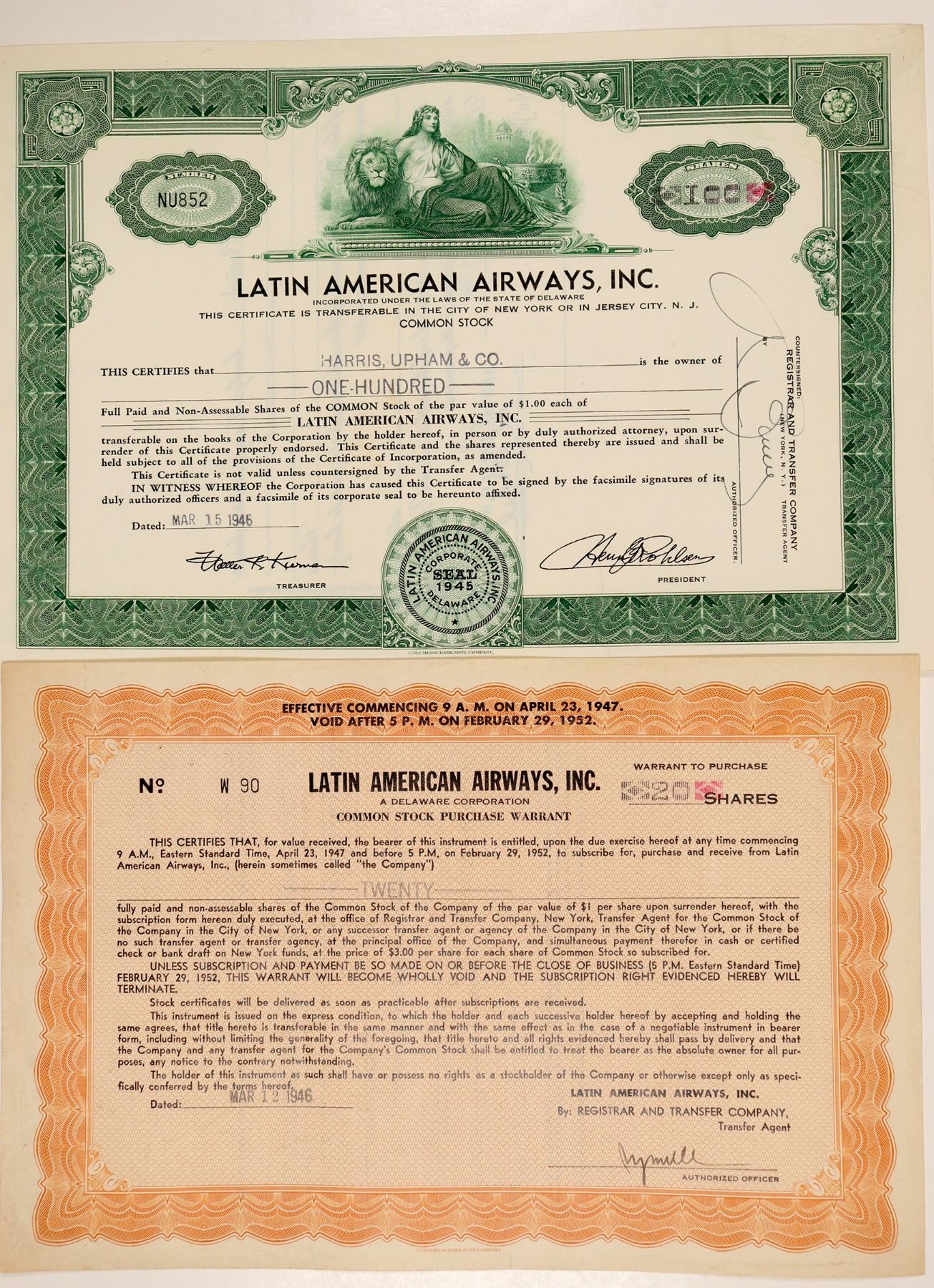 Lot of 2. Stock No. NU582, issued for 100 shares in 1946 and Common Stock Purchase Warrant No. W90, issued for 20 shares in 1946. Neither cancelled. Stock has green border, black print, and allegorical vignette of woman with lion. Purchase warrant has orange border and background. Folds, staple holes. Operated passenger airlines in South America, especially Ecuador. Headquartered in Newark. Ken Prag Collection