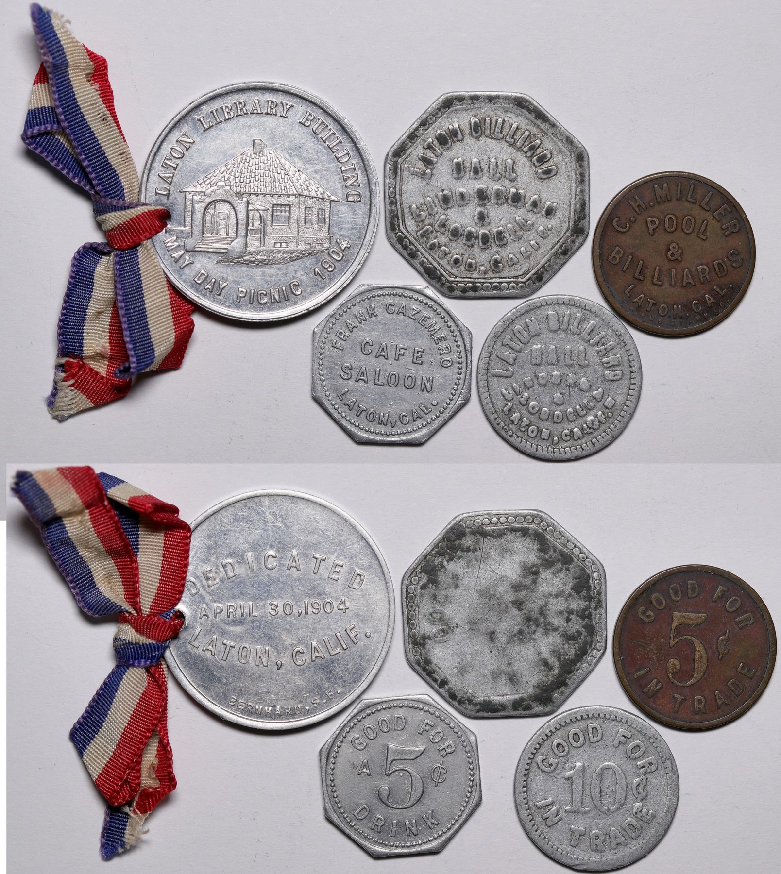Lot of five: 1) C. H. Miller / Pool / & / Billiards / Laton, Cal. // Good For / 5c / In Trade; Br., rd., 21 mm. 2) Laton Billiard / Hall / Linderman / & / Lordell / Laton, Calif. // Good For / 10c / In Trade; Wm, rd., 21 mm. 3) Laton Billiard / Hall /Linderman / & / Loddell / Laton, Calif.; wm, octagonal, 26 mm. 4) Laton Library Building / May Day Picnic 1904 // Dedicated / April 30, 1904 / Laton, Calif. / Bernhard, S. F.; Wm, rd., 30 mm. 5) Frank Cazemero / Cafe / Saloon / Laton, Cal. //Good For / 5c / Drink; Wm, octagonal, 20 mm.