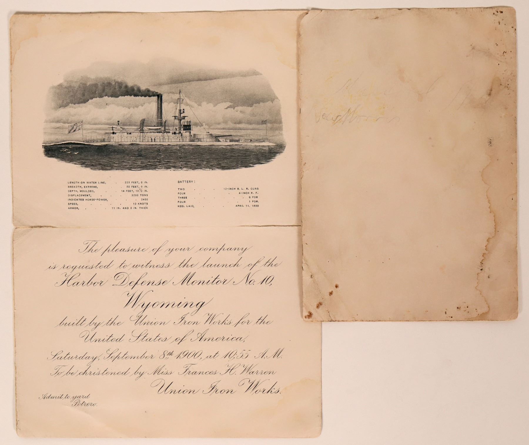 Letter announcing the launch of monitor #10 the USS Wyoming BM10, an Arkansas class monitor. Picture at top of letter and ship details. The letter states launch is Sept 8, 1900 @ !0:55 A.M. To be christened by Miss Francis H. Warren.The second ship of the United States Navy to bear that name, but the first to bear it in honor of the 44th state.The first U.S. ship to be converted from coal to oil. In service from 1903-25. Sold for scrap, 20 April 1939. Extremely rare.