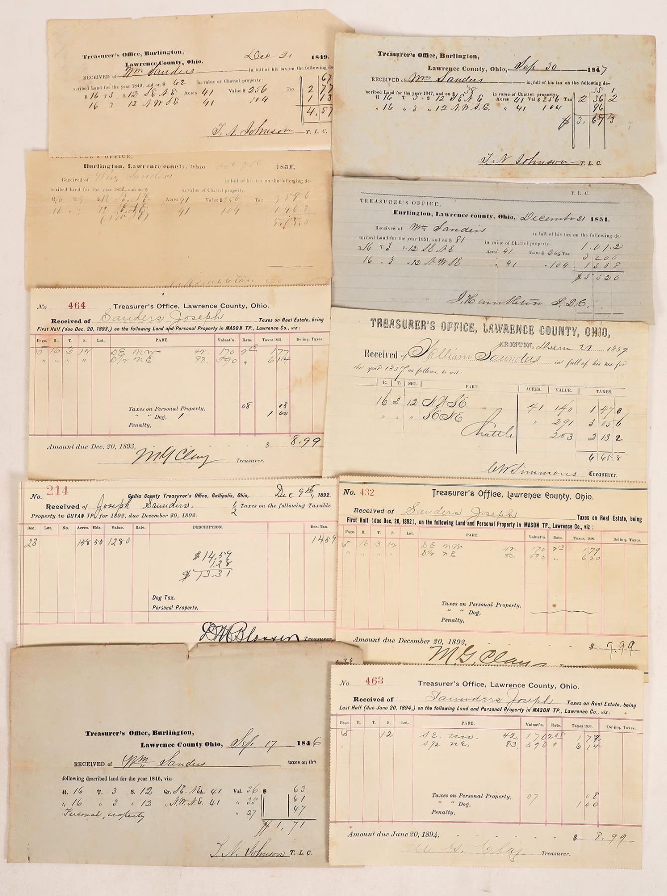 A collection of 10 Burlington, Lawrence County, Ohio, Treasurer's Office receipts, c1846-94. Please see photo(s) for more details.[ Burlington Ohio