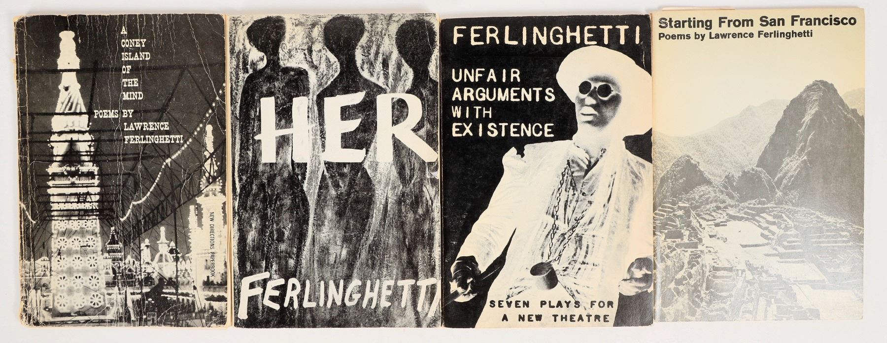 Lot of 4. Four books by Lawrence Ferlinghetti (1919-2021). Unfair Arguments With Existence (118 pgs), Starting From San Francisco (64 pgs), A Coney Island Of The Mind (93 pgs) and Her (117 pgs). Lawrence Ferlinghetti was an American poet, painter, social activist and co-founder of City Lights Booksellers & Publishers. He authored poetry, translations, fiction, theatre, art criticism and film narration. His writing style is in the vein of T.S. Elliot.