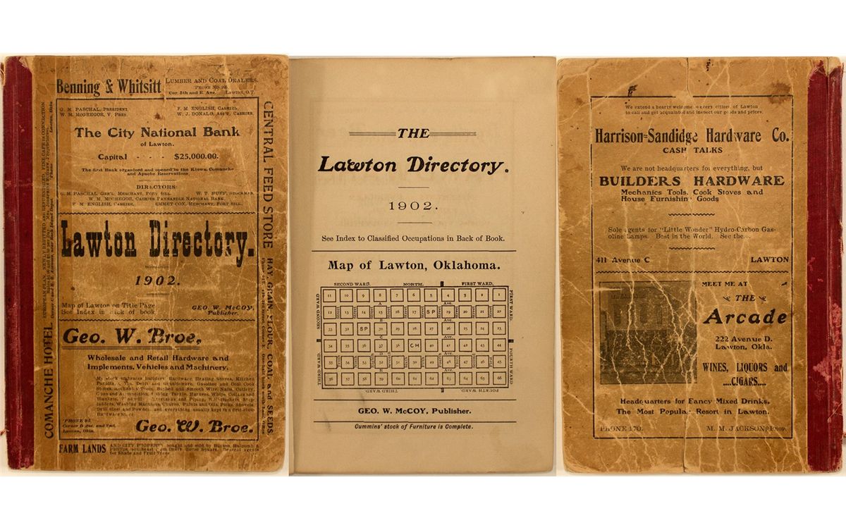 "Lawton Directory," and page continues with a map of Lawton, "Geo. W. McCoy, Publisher." Advertising throughout. 66 pages, with 5 pages of advertising. In very good condition overall. There are no loose pages, and the back paper cover has a crease crack. Rarity: [i]City: LawtonCounty: State: OKDate: 1902