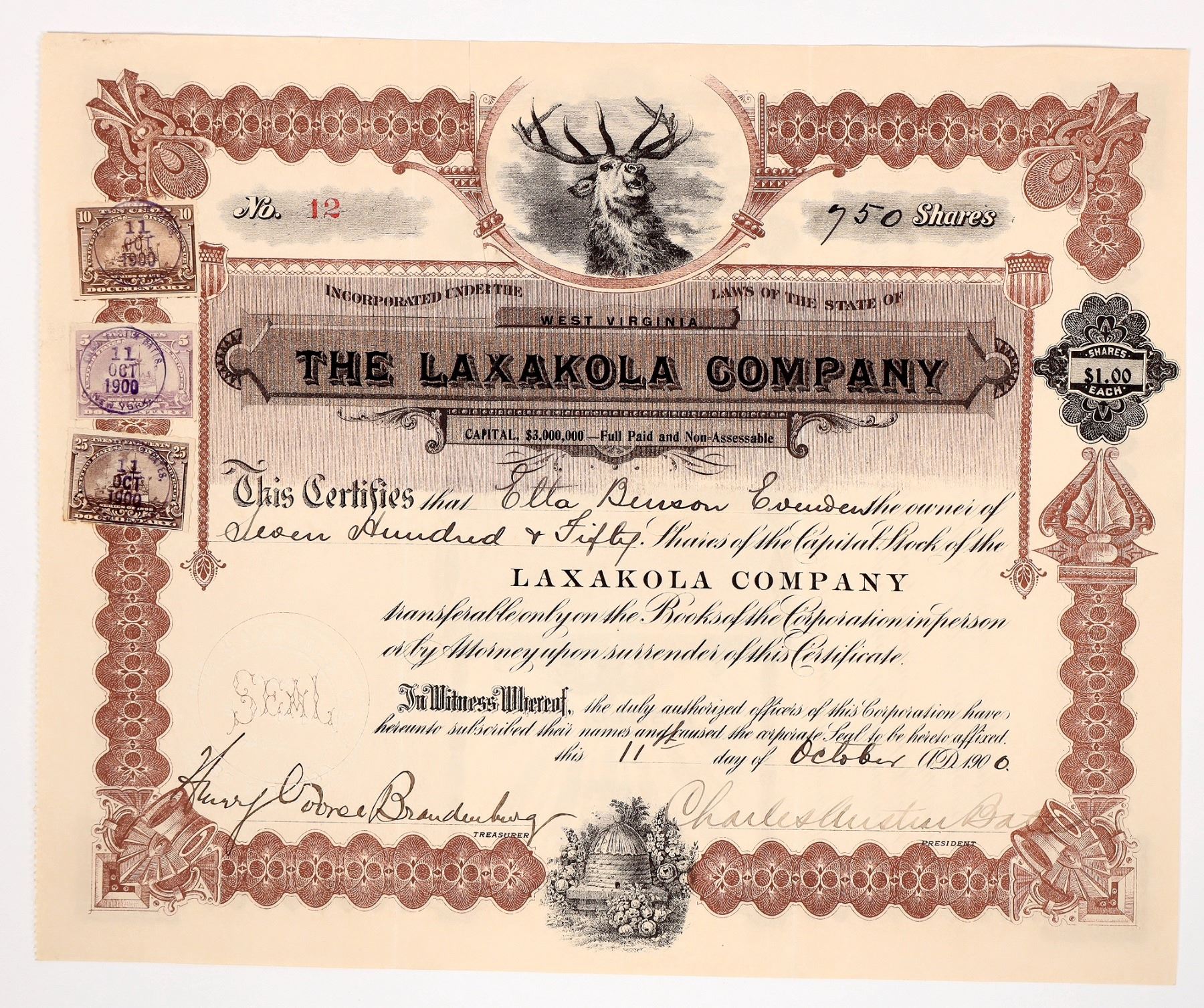 Stock certificate for 750 shares in the Laxakola Company, made out to Etta Benson Evendew in 1900. Signed by treasurer Brandenburg and president Batts, embossed company seal at bottom left. Three stamps at left. Two vignettes, a stag and a beehive. Good condition with some minor wear/creasing.