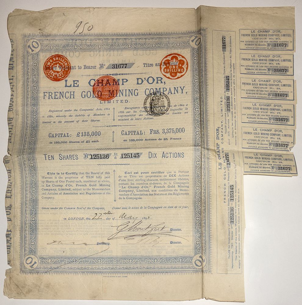 Le Champ d'Or, French Gold, May 22, 1895. Share Warrant issued from London. Ten shares, nos. 125136 to 125145. Bearer no. 31677. Half of the certificate is in French.