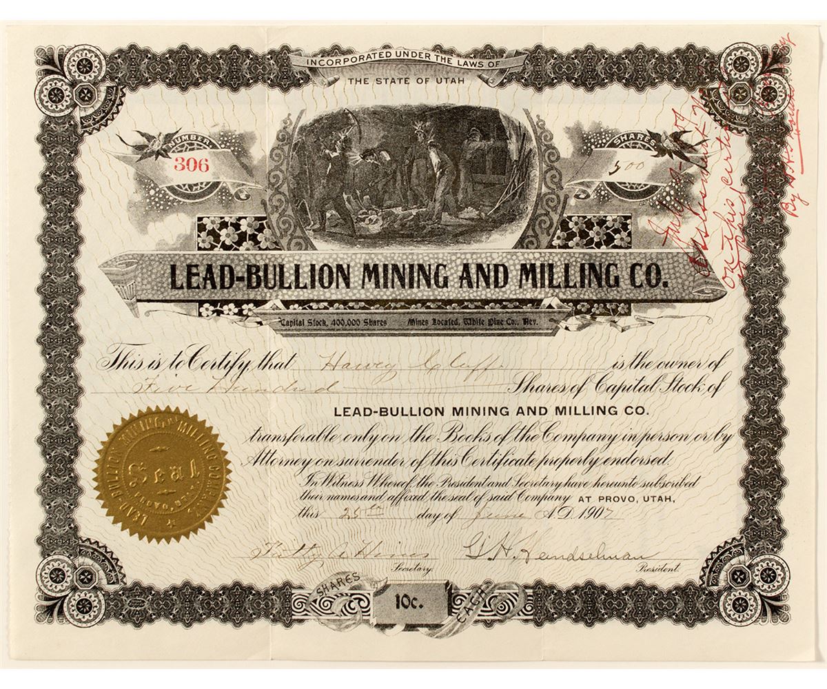 Rare certificate from "Lead-Bullion Mining and Milling Co." (uncancelled). Certificate #306 grants Harvey Gluff (?) 500 shares, signed by the President and Secretary. In excellent condition, with gold seal, and hand-written Assessment on the upper corner. Beautiful central vignette with ornate scroll borders. Executed on the reverse side.