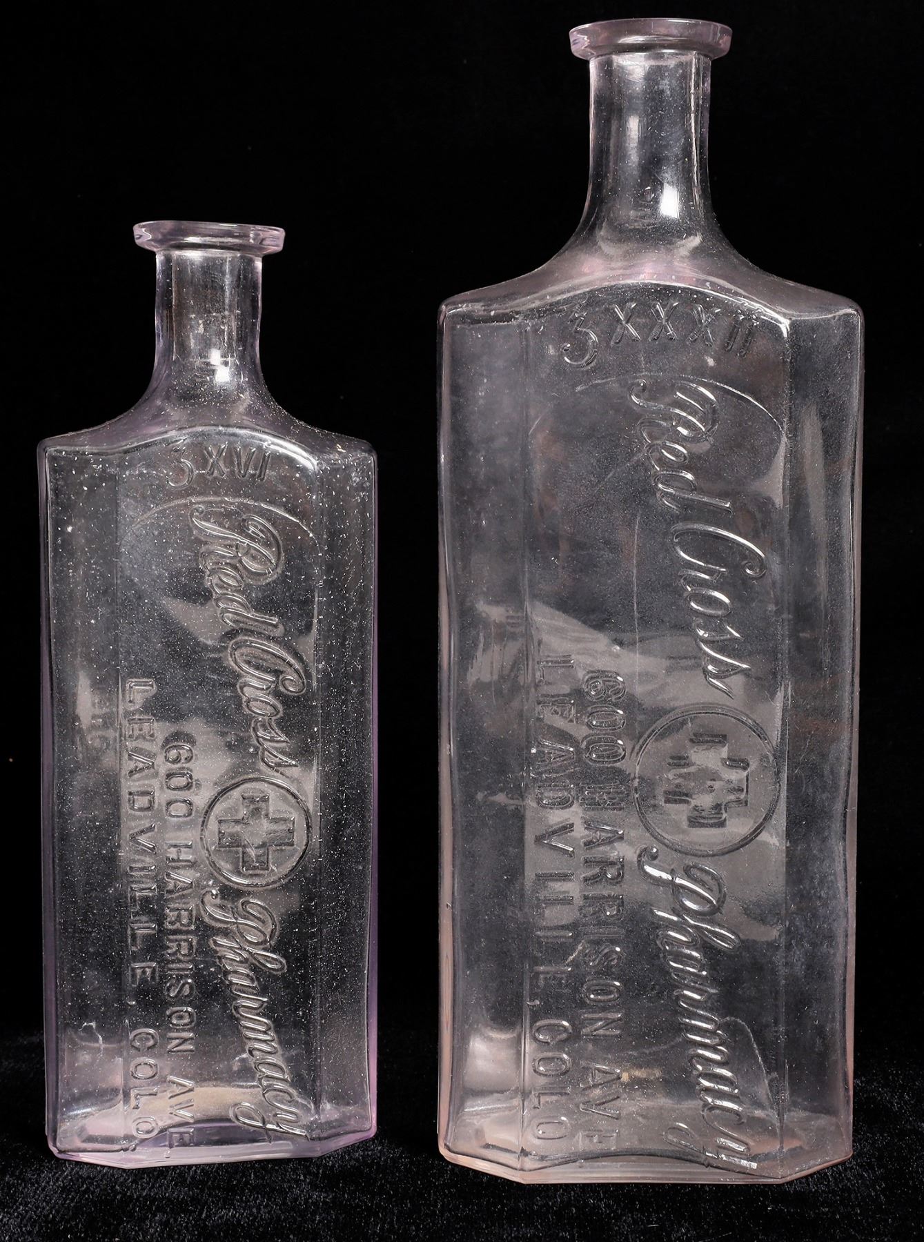 2 embossed large Leadville Red Cross druggist bottles. 16oz and 32 oz. No apparent chips or cracks. Leadville Colorado