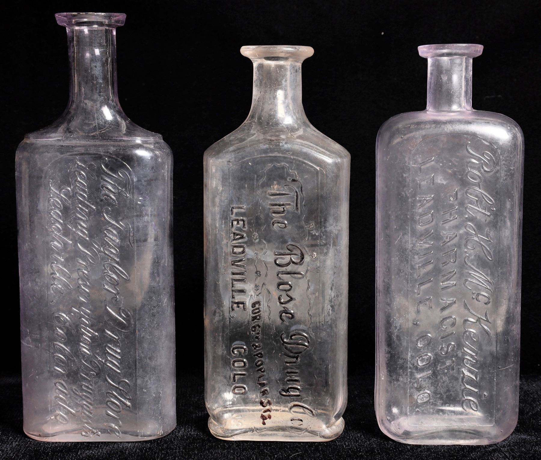 3 Leadville 16oz druggist bottles. Black embossed The Blose Drug. The Taylor Drug Store. Robt. H. Kenrie Pharmacist. Leadville Colorado