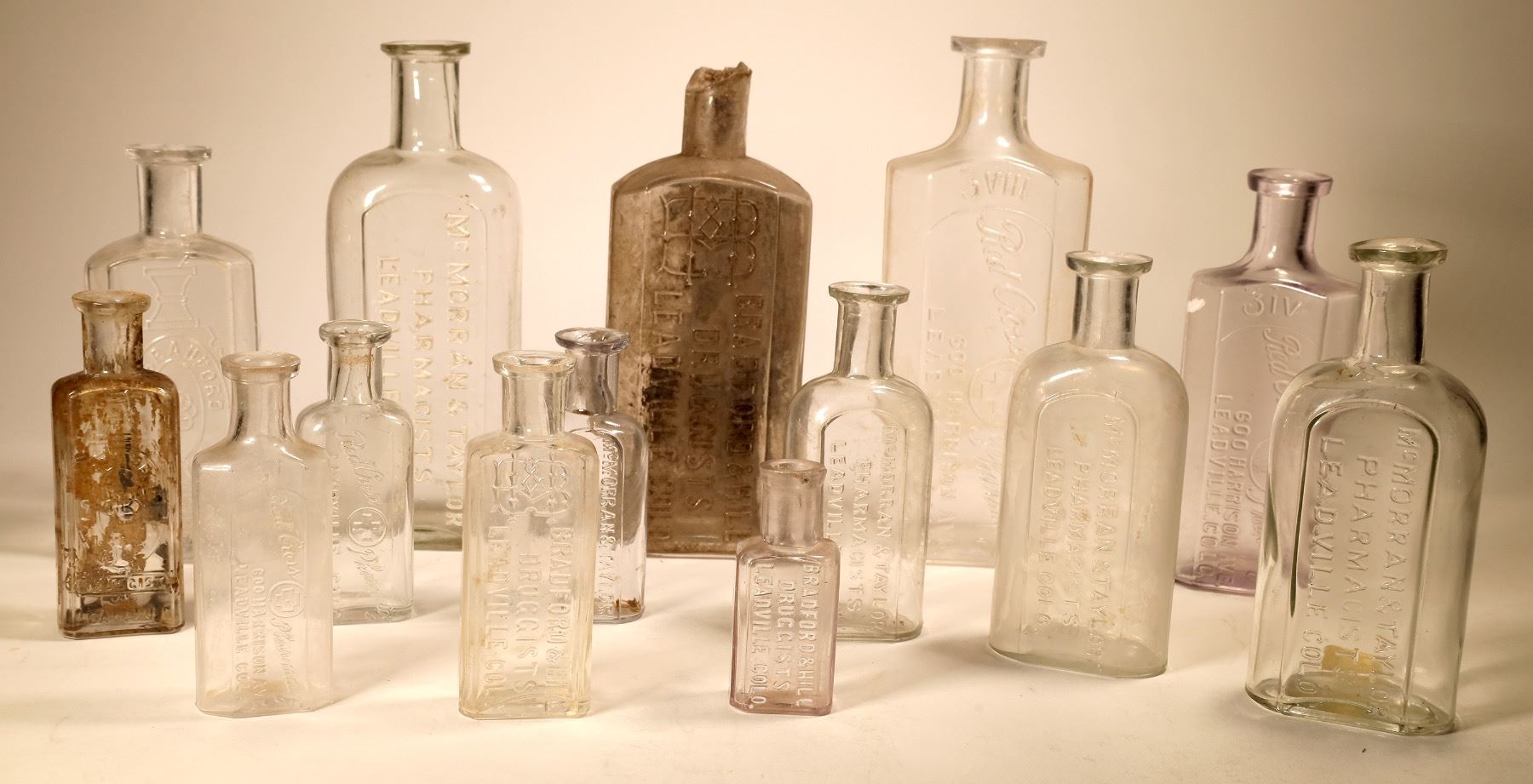 This group contains fourteen Leadville. Colorado medicine bottles. The bottles range in size from 3 3/8" to 7". This lot contains examples from: McMORRAN & TAYLOR (5),RED CROSS PHARMACY (4), O.F.BRADORD & HILL (2), BRADFORD & HILL (3).