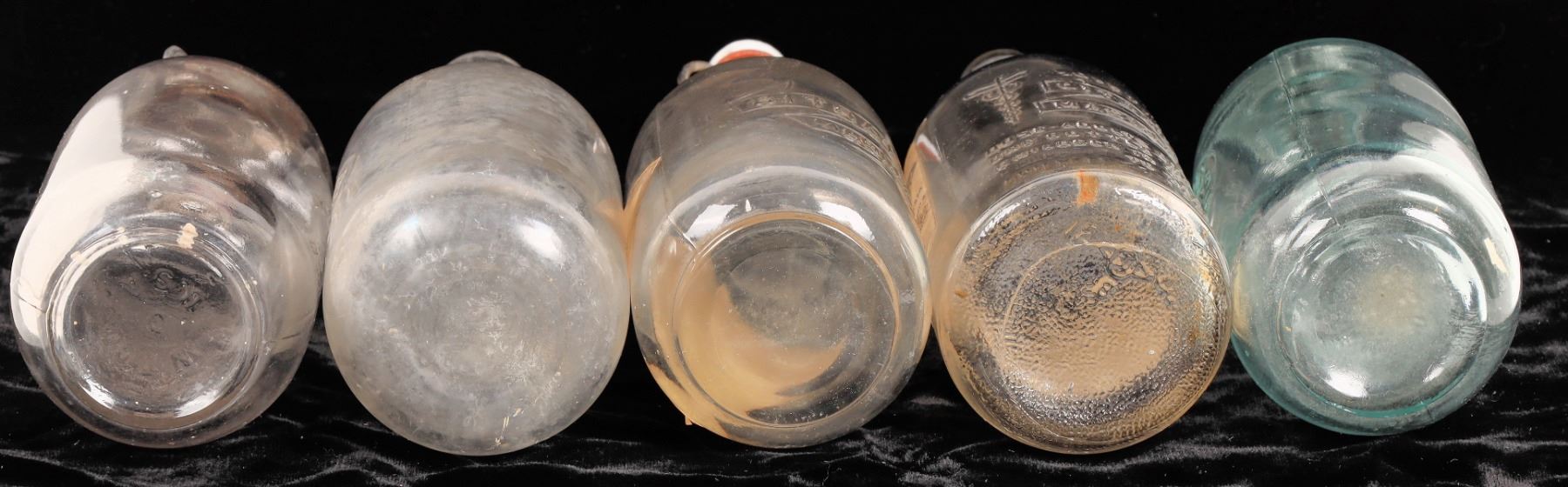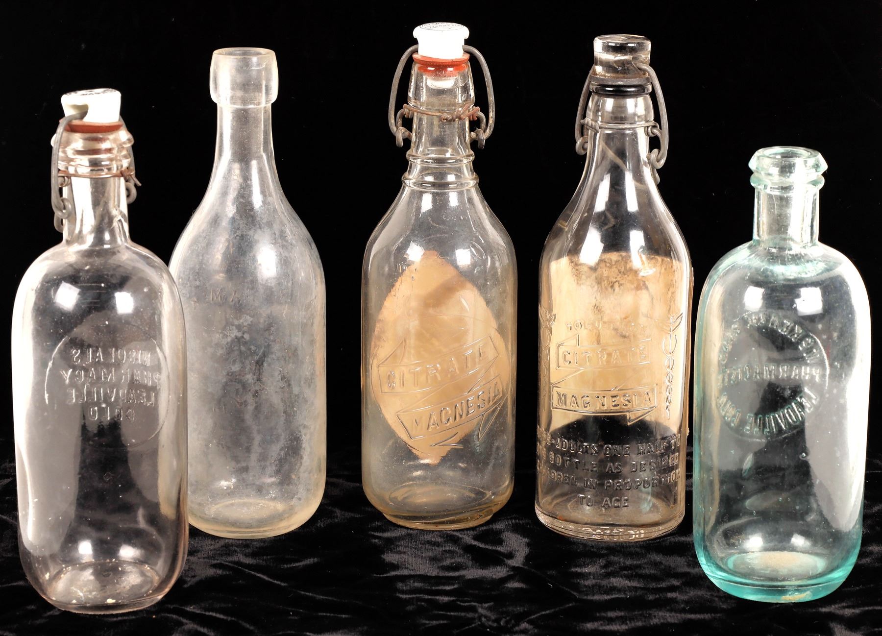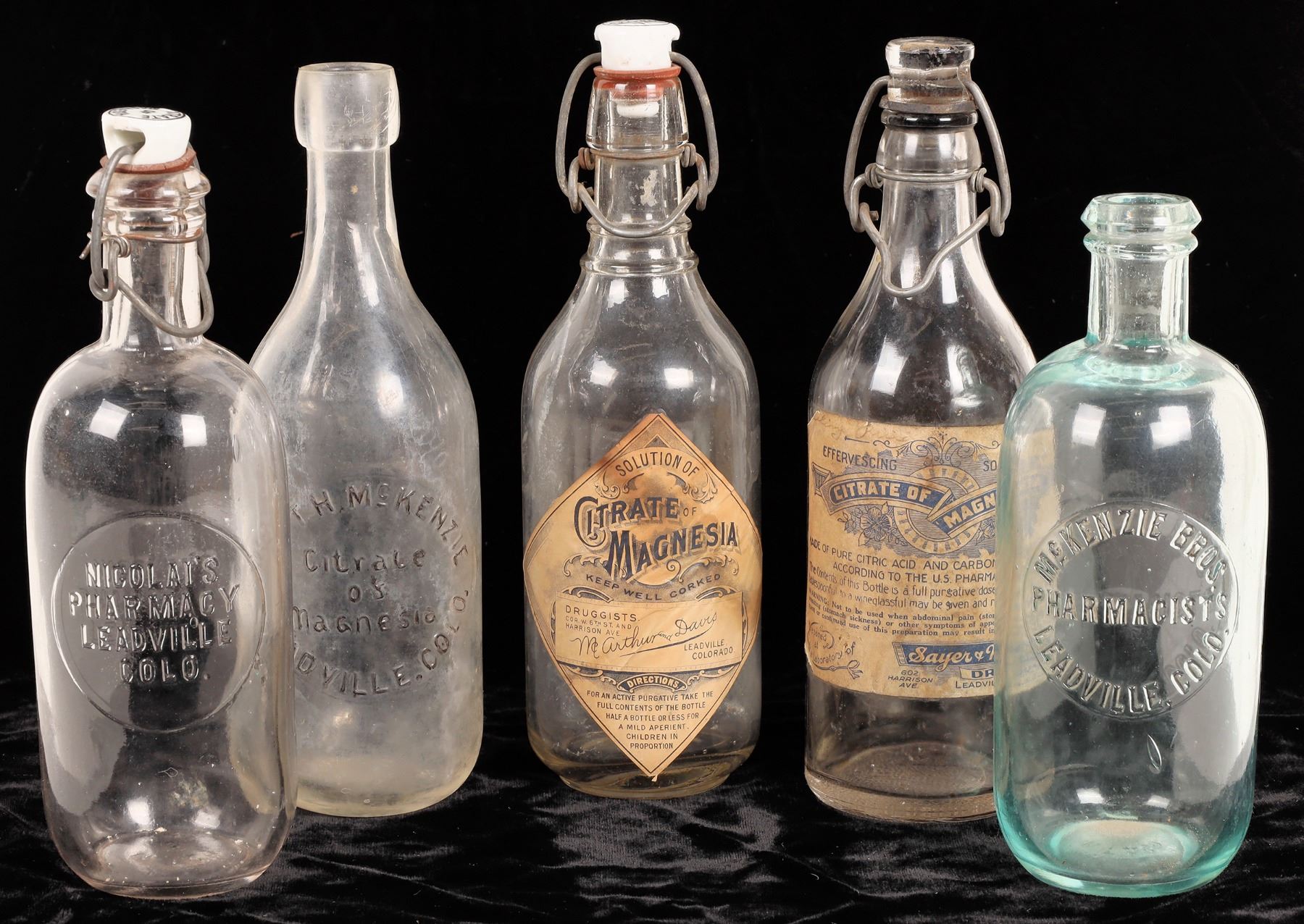 5 Leadville citrate bottles. Clear swingtop Nicolai's Pharmacy/Leadville Colo. 8". Clear full paper label swingtop McArthur & Davis Druggists 8.25". Clear swingtop mostly intact paper label Sawyer & McKee Drug Co. 8.5". Light aqua McKenzie Bros/Pharmacist 7.25". Clear Rob't H McKenzie 8.25". No apparent chips or cracks. Leadville Colorado