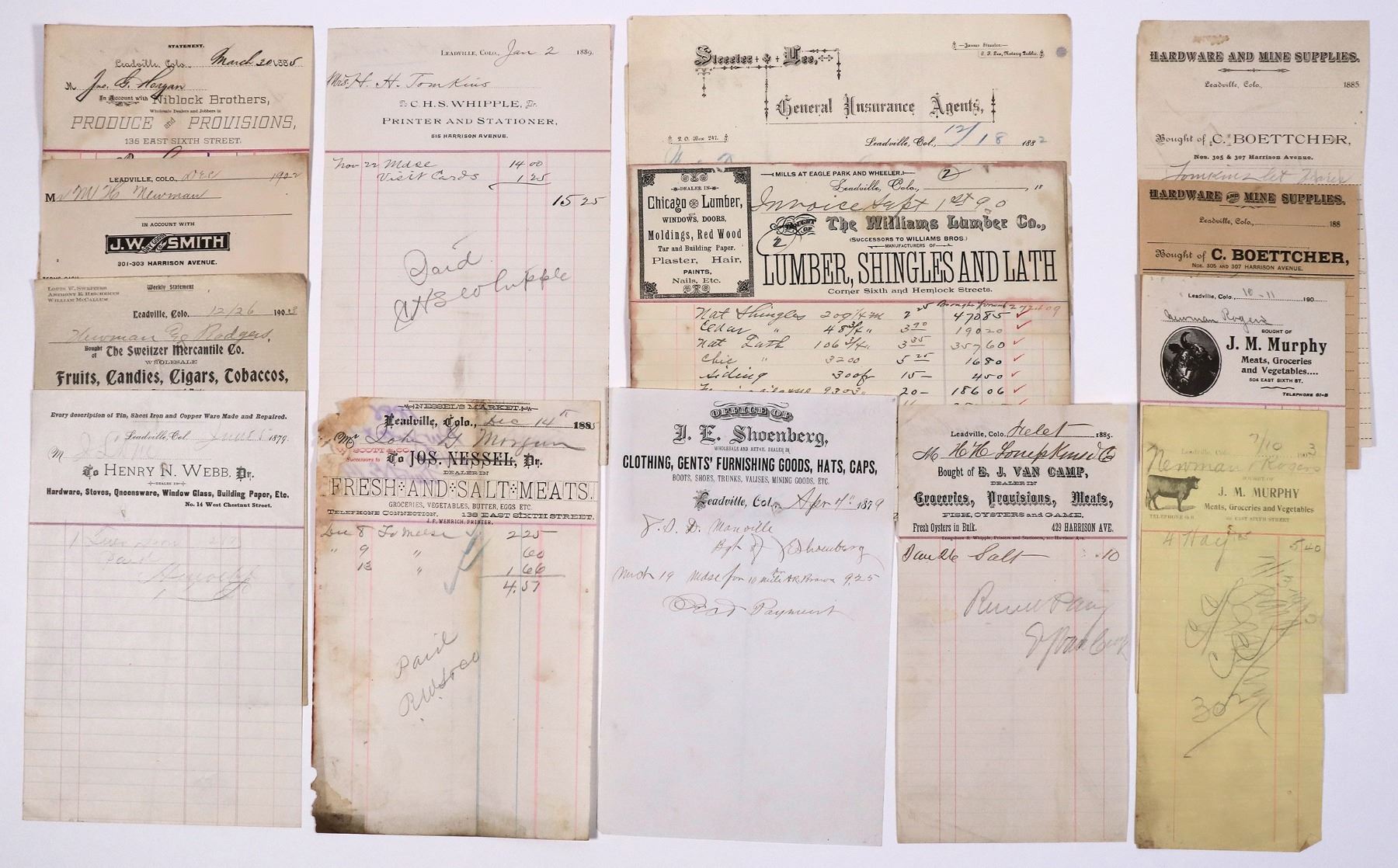 Lot of 14 different billheads and receipts. Includes: C. Boettcher, mine supplies (2 different, 1880s); Shoenberg, mens clothing and mining goods (1879); CHS Whipple, printer (1889); Jos. Nessel, meats (1885); EJ Van Camp, grocers (1885); Henry N. Webb, hardware (1879); JM Murphy, meats (two different, 1903, pictorial); Williams Lumber Co. (1880s); Sweitzer Mercantile Co., fruits, candies (1903); Steeler & Co., insurance agents (1882); JW Smith, dry goods (1902); and Niblock Brothers, produce (1885).