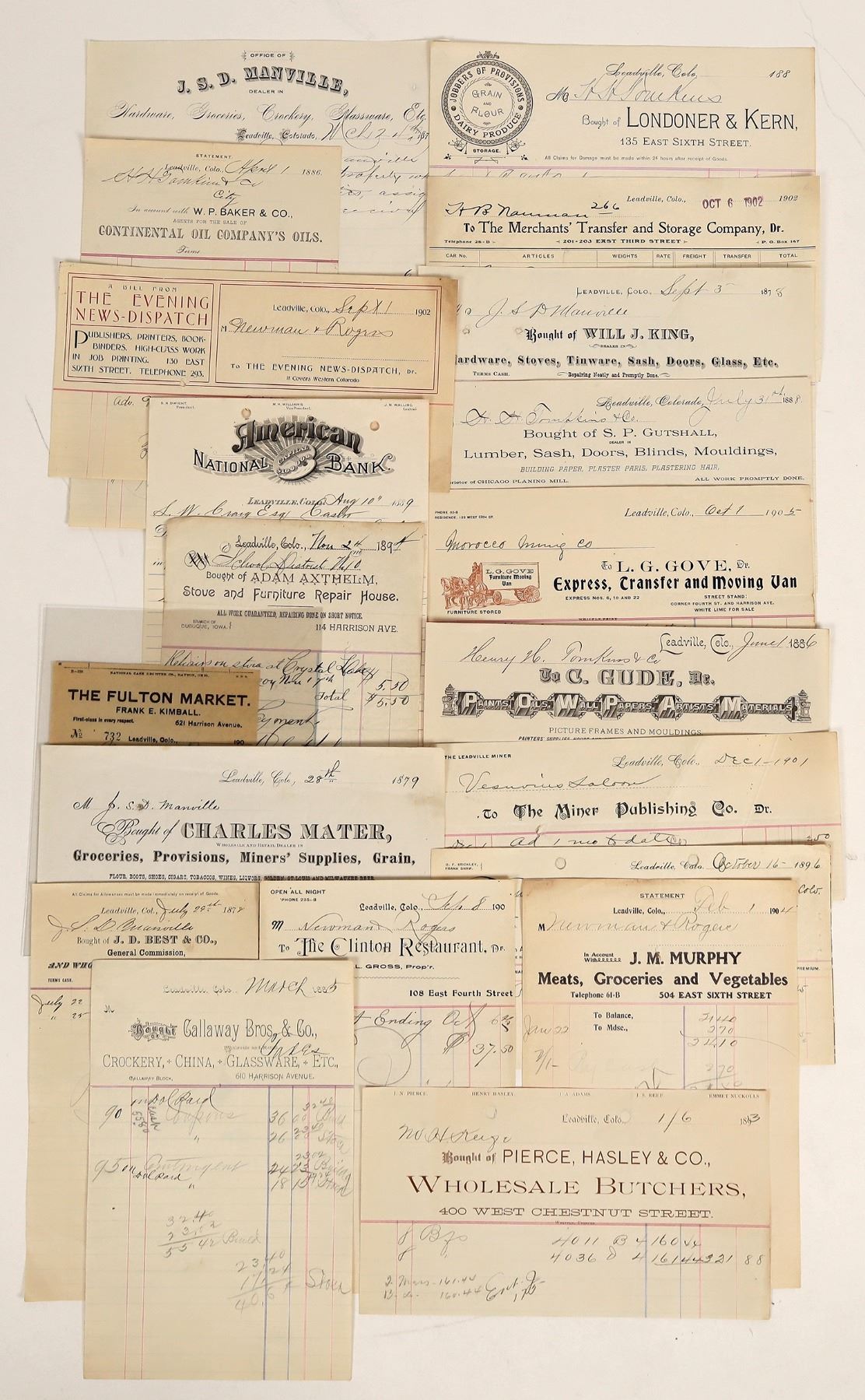 Lot of 20 different. Instant collection. Includes: JM Murphy, Meats (1904); Pierce, Hasley & Co., Butchers (1893); Stickley & Shaw, Insurance (1896); JD Best & Co., Produce (1878); Charles Mater, Miners' Supplies (1879); Fulton Market (1900); The Miner Publishing Co. (1901); American National Bank (1889); Adam Axthelm, Stoves (1894); The Evening News-Dispatch (1902); C. Gude, Paints (1886); LG Gove, Express (1905); SP Gutshall, Lumber (1888); Will J. King, hardware (1878); Londoner & Kern, provisions (1880s); Merchants' Transfer & Storage Co. (1902); WP Baker & Co., Continental Oil Co. (1886); The Clinton Restaurant (1900); JSD Manville, hardware (1879); and Callaway Bros. & Co., crockery (1885). Please inspect.