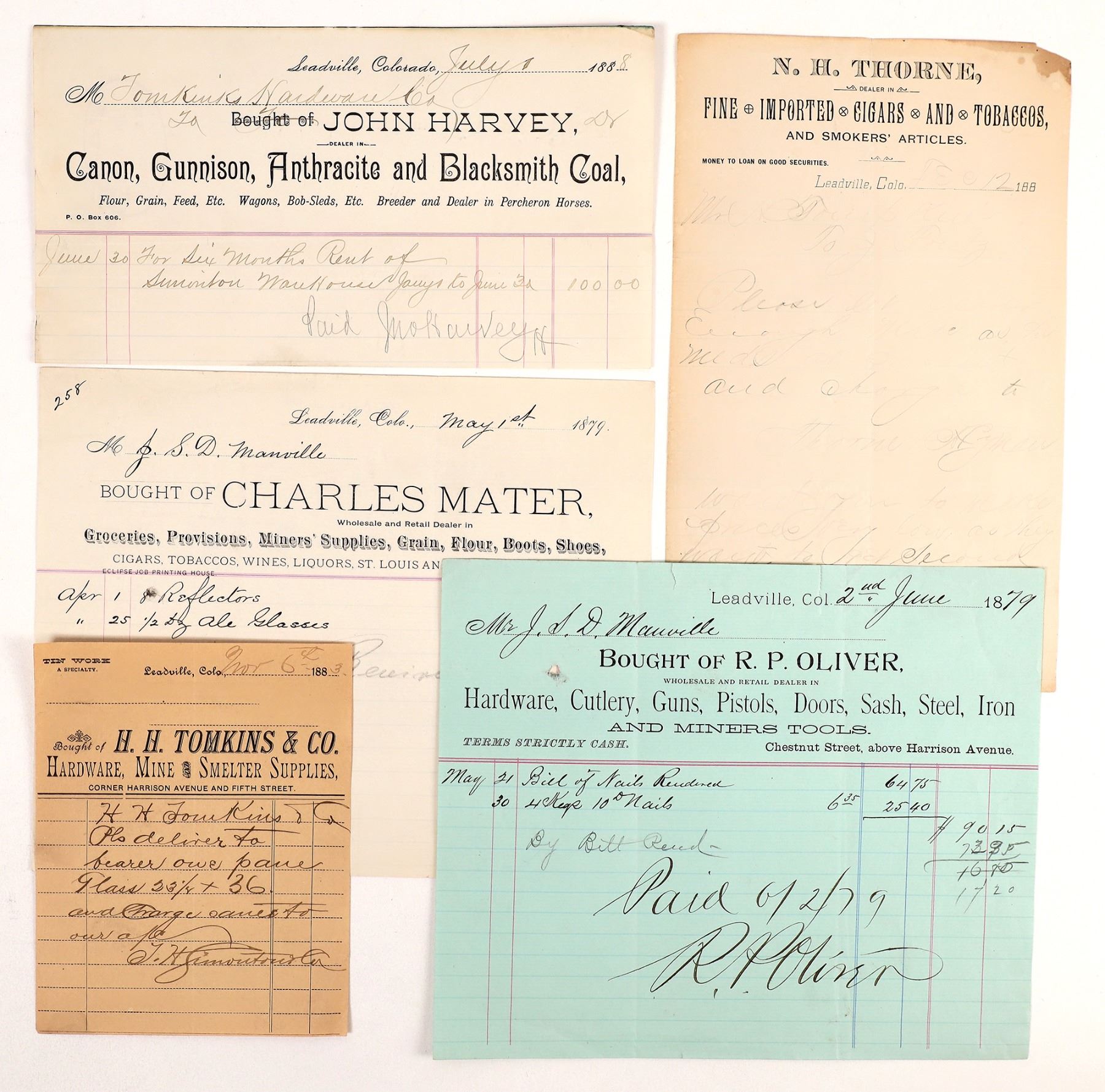 Lot of 5 different. Includes: Charles Mater (1879, Groceries); John Harvey (Coal, 1888);NH Thorne (Cigars, 1880s); RP Oliver (Guns and Hardware, 1879); and HH Tomkins & Co. (Mine & Smelter Supplies, 1883). Nice early group!
