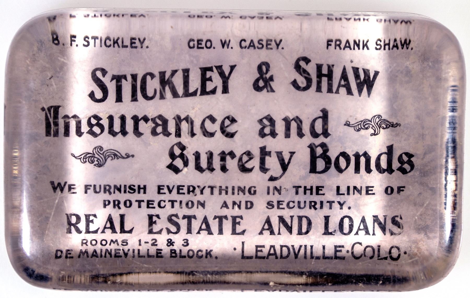Stickley & Shaw Insurance and Surety Bonds glass paperweight, Leadville-Colo. 2 3/8x4.