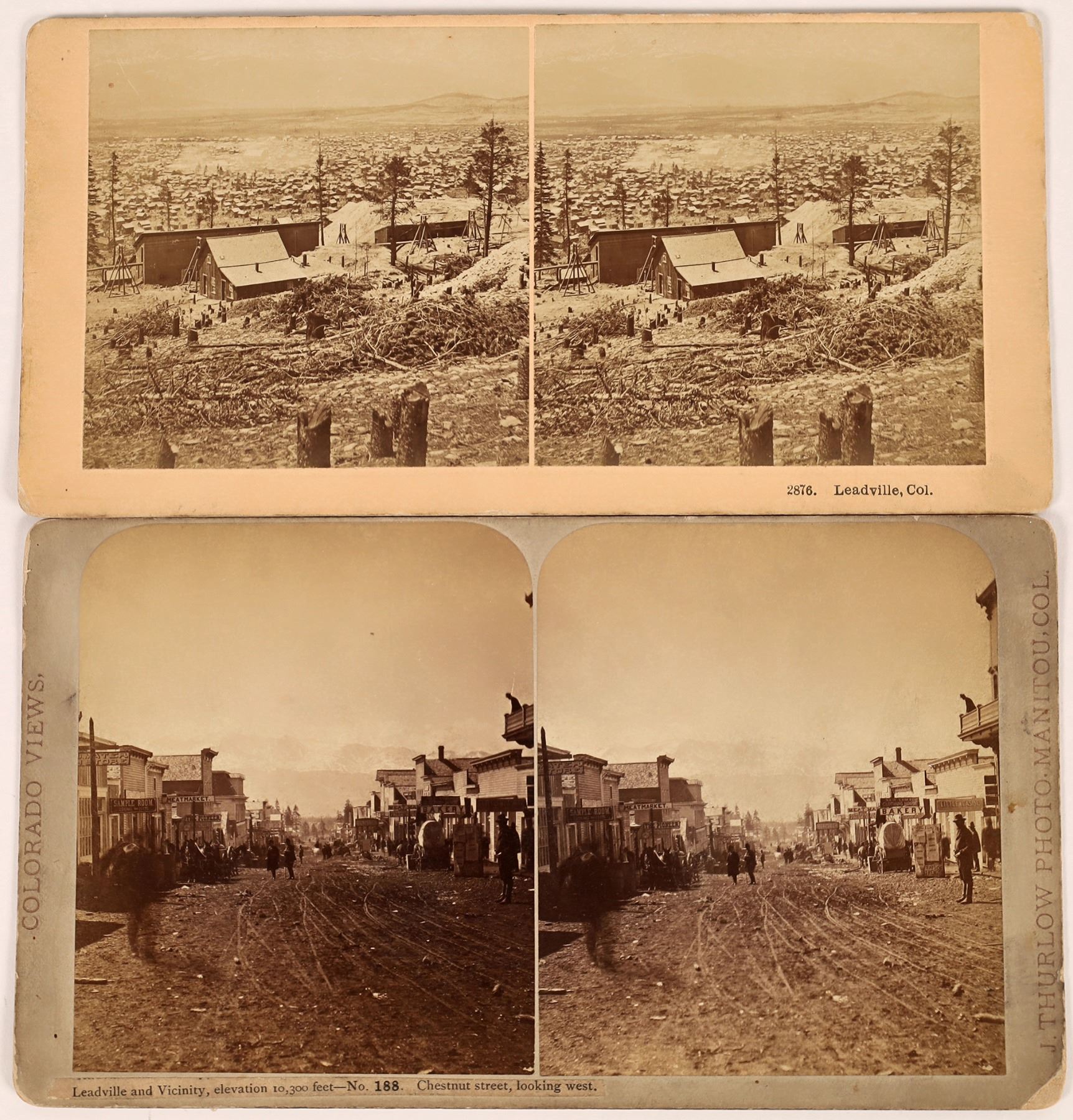 Lot of 2 different. 1)J. Thurlow Photo, Manitou, Col. No. 188. "Chestnut street, looking west." Fantastic early view with easily readable signage. Dirt road has people and wagons! Pen notations on back that this was presented to the Soldiers Home by William Lakey, Co. D 17 New York Volunteer. c.1870s. 2) Mining scene by Kilburn Brothers. A large town sits below with a myriad of small buildings. # 2876. Leadville Colorado