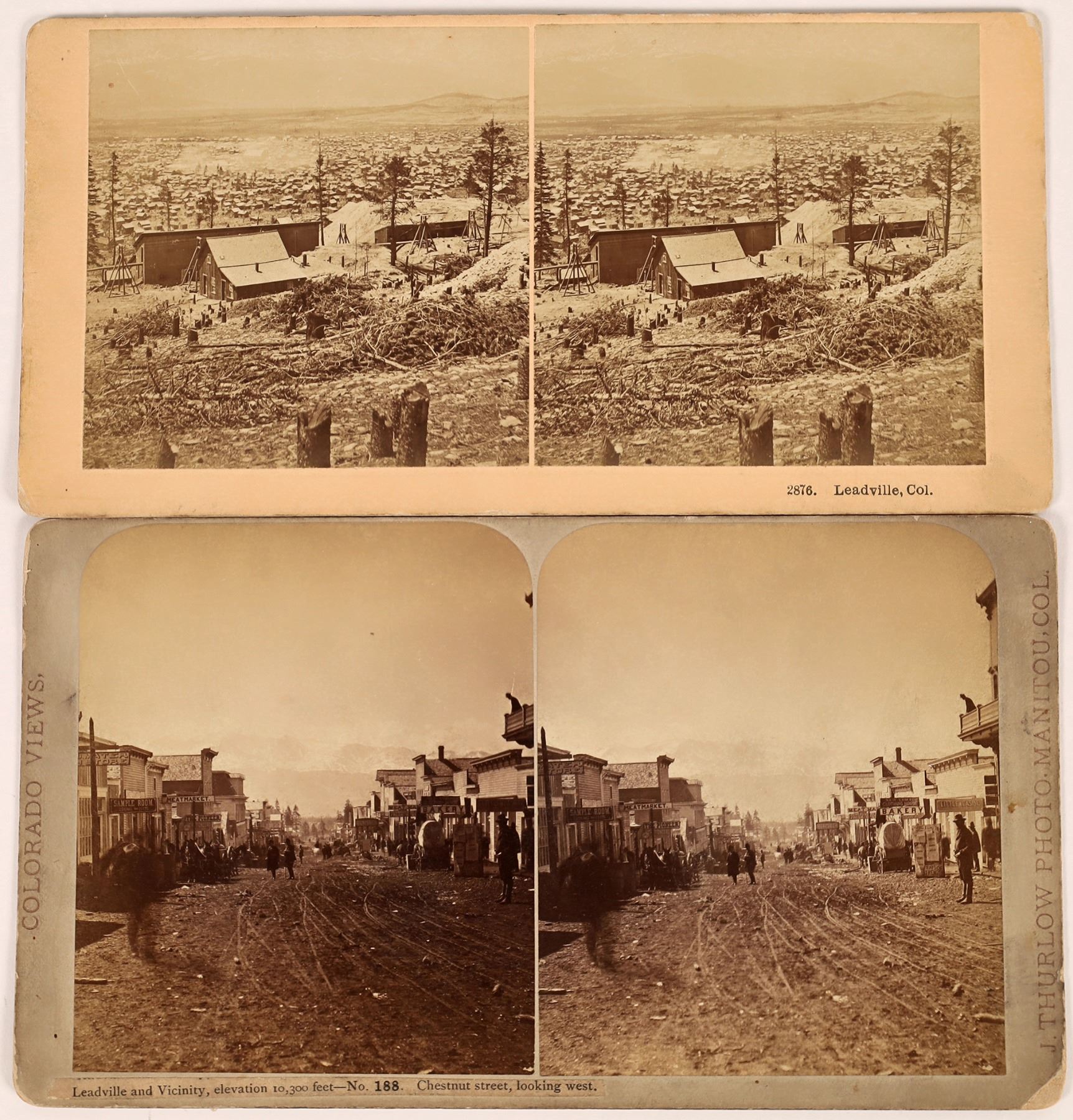 Lot of 2 different. 1)J. Thurlow Photo, Manitou, Col. No. 188. "Chestnut street, looking west." Fantastic early view with easily readable signage. Dirt road has people and wagons! Pen notations on back that this was presented to the Soldiers Home by William Lakey, Co. D 17 New York Volunteer. c.1870s. 2) Mining scene by Kilburn Brothers. A large town sits below with a myriad of small buildings. # 2876. Leadville Colorado Franklin Collection