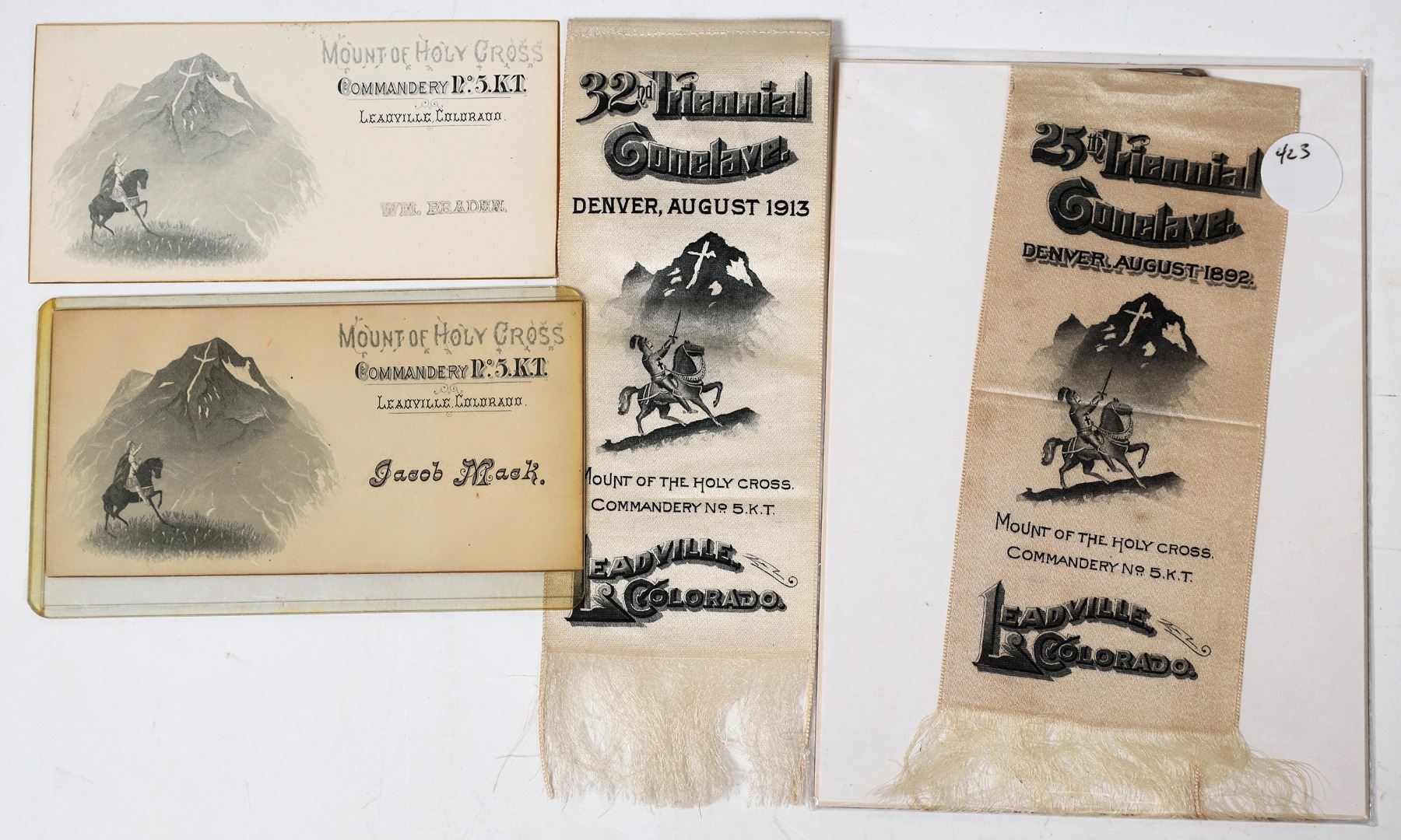 Lot of four pieces of ephemera from the Mount of the Holy Cross Commandery in Leadville Colorado. There are two ribbons, one from the 25th Triennial Conclave in Denver, August 1892, and the other from the 32nd Triennial Conclave in Denver, August 1913. The other two pieces are membership cards that belonged to Jacob Mack and Wm. Braden. Good condition.
