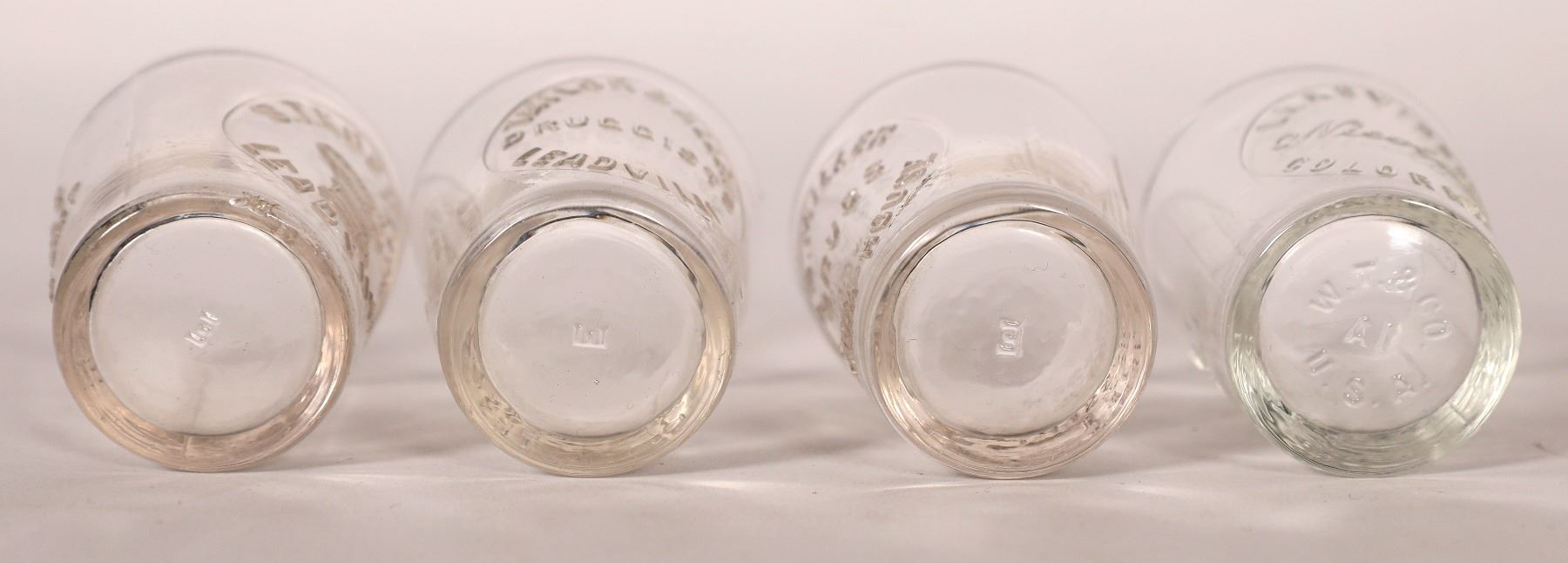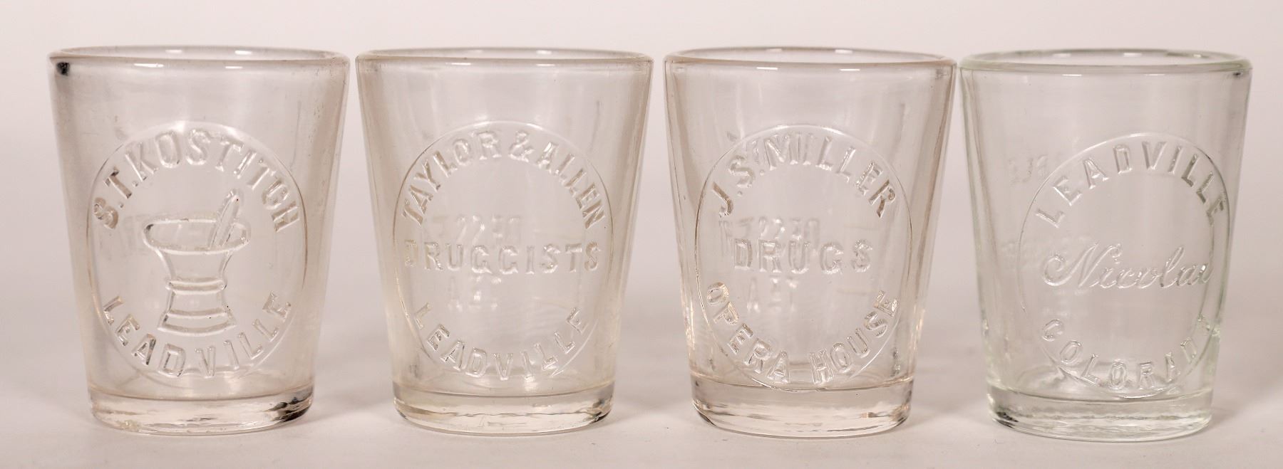 Leadville/Nicolai/Colorado, J S Miller/Drugs/Opera House, S T Kostich/Leadville, Taylor & Allen/Druggists/Leadville. All 1.8". No apparent chips or cracks. Reed Collection.
