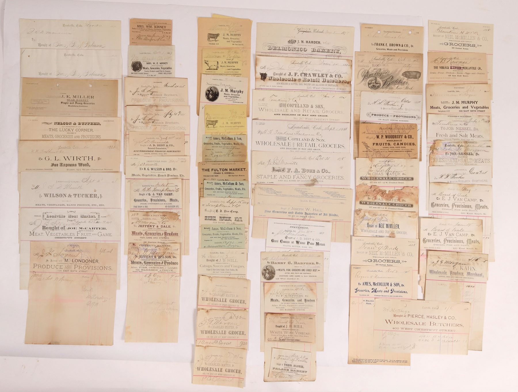 About 50 Leadville food and grocery billheads. Some pictorial. JF Crawley, Copeland & Son, FA Buse, Frank E Brown, Joseph W Hall, JD Best, Ames, McCollum & Son, Fulton Market and more. Some stains and condition issues, please inspect.