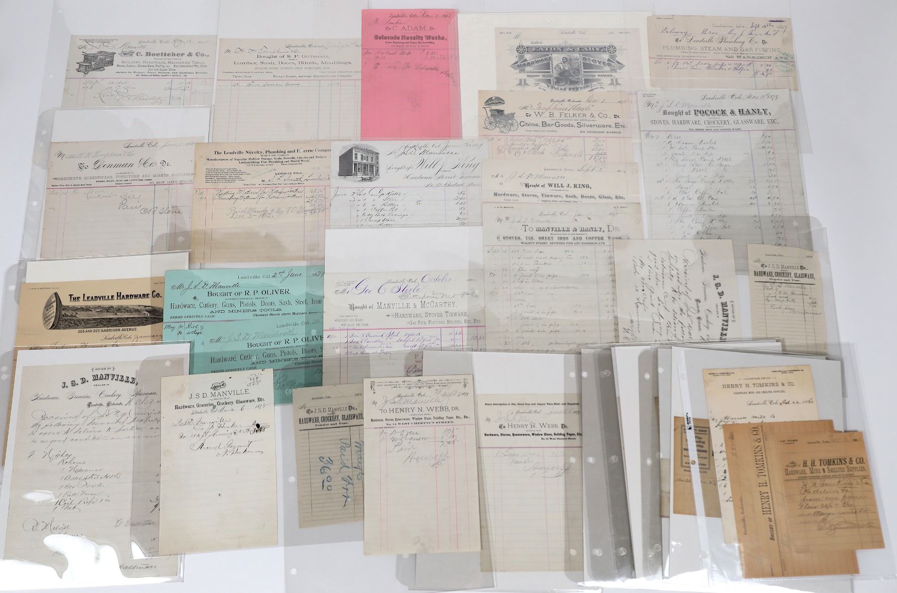 Group of about 34 billheads from hardware companies in Leadville, Colorado. Some examples include the Leadville Hardware Co., Leadville Plumbing Co., and C. Boettcher & Co. These billheads are from the late 1870s to 1910s. Some are pictorial. They are encased in protective sleeves that are 9.5 x 11.5 inches. Good condition.