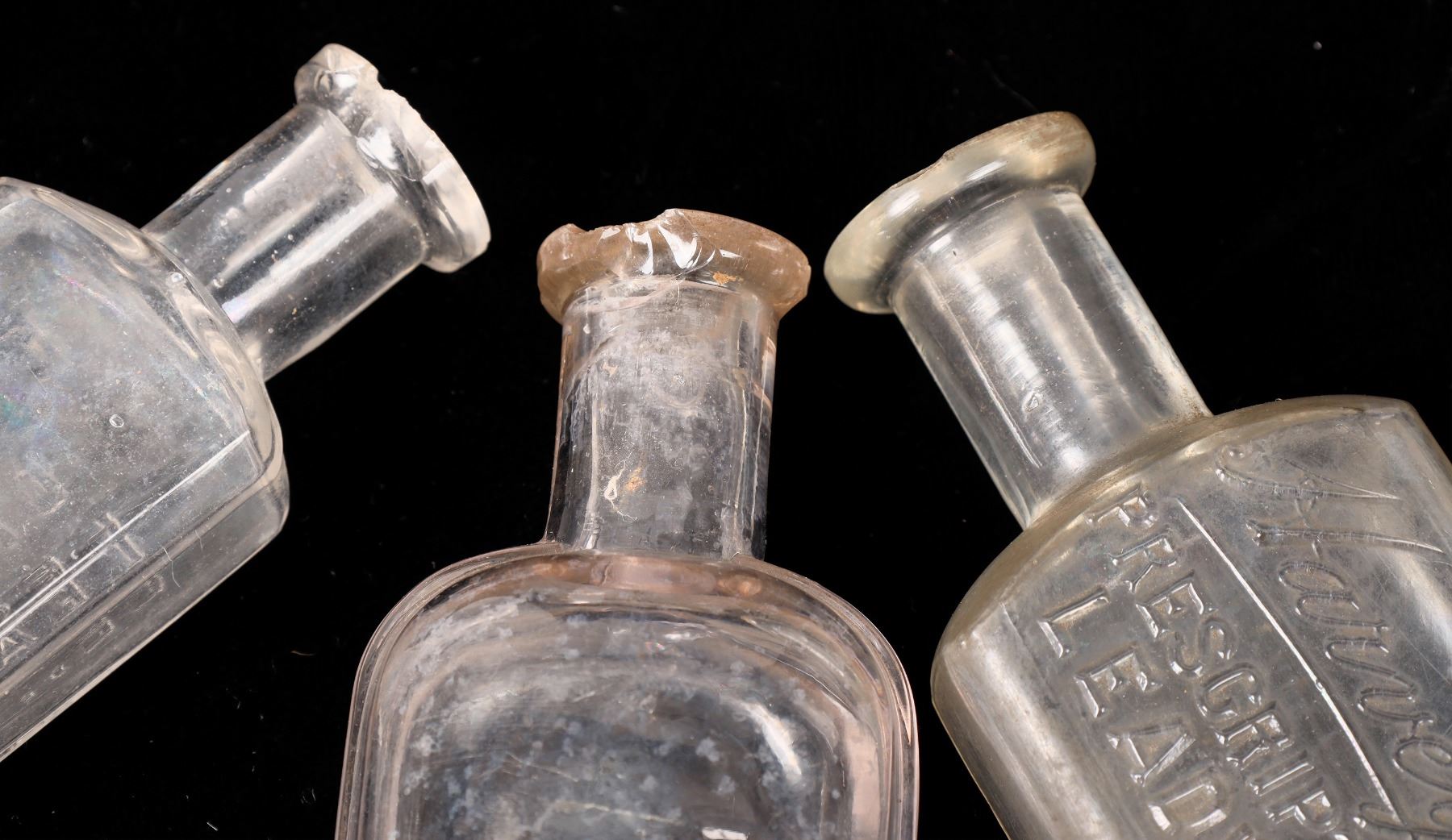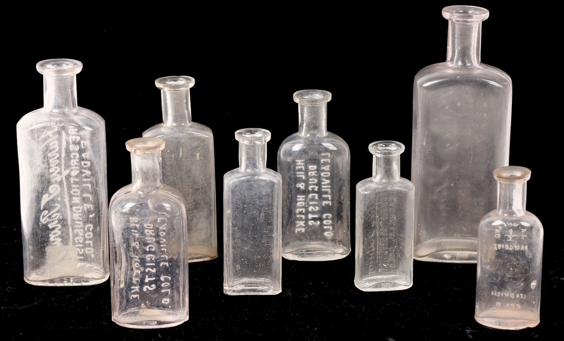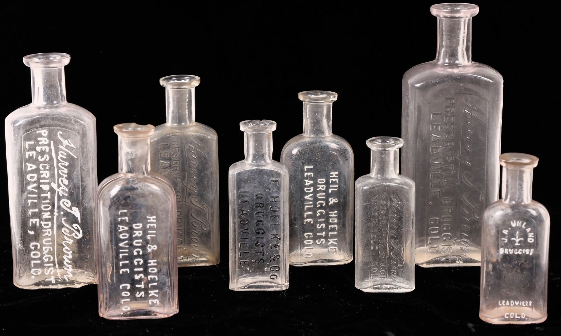 8 R3 Leadville medicine bottles. 4 different Harvey T. Brown/Prescription Druggist/ Leadville, Colo.3.5", 4.5", 5.25", 6.25". Heil &Hoelke/Druggists/Leadville Colo 4" 2 lip chips, 4.25".J. A. Uhland/Druggist/Leadville Colo 3.5"internal ding. E. Hoelke & Co/Druggists/Leadville 3.75" large lip chip. No apparent cracks.