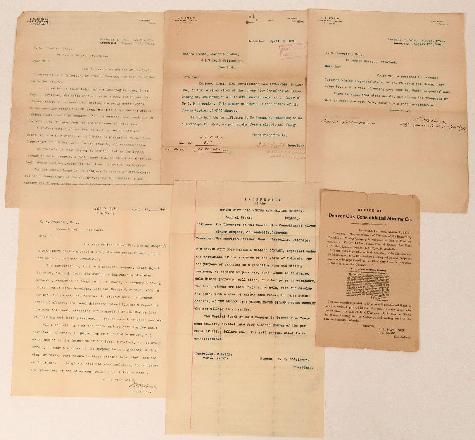 Lot of 6. Deals with two Leadville mines: 1) Denver City Consolidated Mining Company. Includes: letter about stockholder's meeting; 1895 carbon copy of prospectus statement for the company; and two typed letters, 1891 and 1895, Leadville and Denver datelines. These letters discuss forming the Denver City Gold Mining & Milling Company, as well as reissued stock certificates to JD Brewster; 2) Sulphide Mining Company. Two typed letters, both 1894, from Leadville to KS Brewster in New York. Regarding stock in the Sulphide Mining Co., formerly the Lee Basing Mining Co.