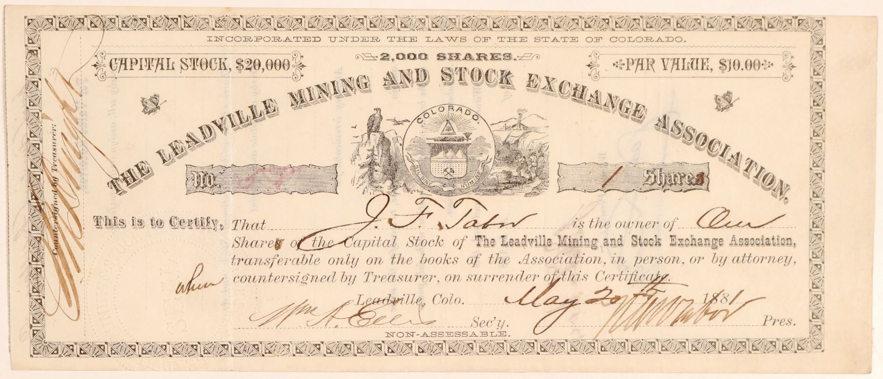 Stock Certificate from the Leadville Mining and Stock Exchange. Incorporated in Colorado. Located at Leadville. Certificate number 58 for 1 share issued in 1881 at Leadville, Colorado to J.F. Tabor, Signed by HAW Tabor and William A Leeds(?). Size 9.25" by 4". Not cancelled. Allegorical vignette. Company seal, Horace Austin Warner Tabor is known as the Bonanza King of Leadville. He was a United States for three months replacing Henry Teller. He was also the second Lt. Governor of Colorado. Incorporated in 1879. Re-incorporated in 1881. This exchange had a short life and was finished in 1882. [Mining Stock Exchanges and Financing the Colorado Mining Industry: 1864 - 1900 by Copeland]