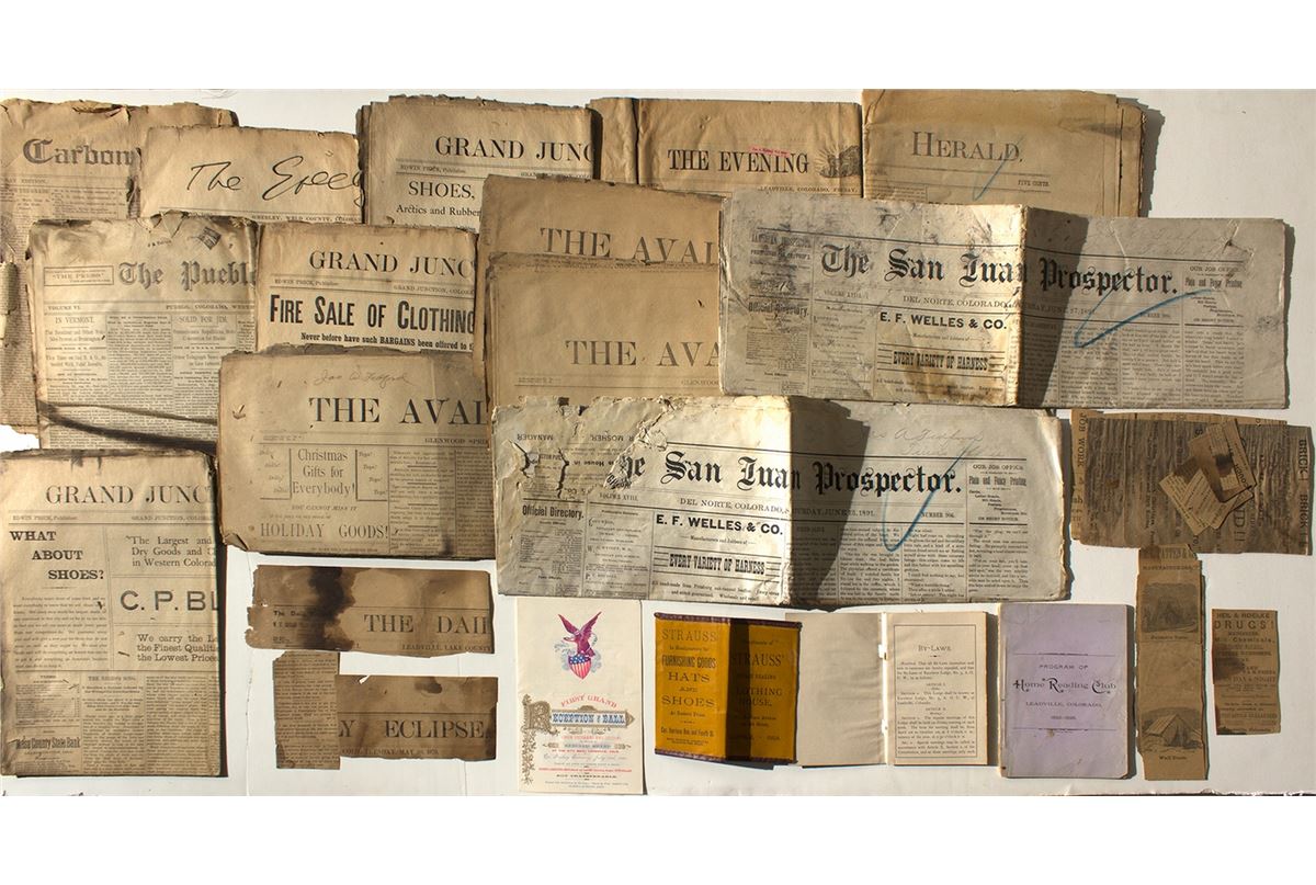1) Leadville newspapers. Around 12 Leadville newspapers in very fragile condition. Around 1891. 2)Leadville newspapers. 1879 Eclipse headline. Around 12 small articles and advertisements. Very Fragile. 3) Notebook. 2 1/2" x 5'.Complements of Strauss' Square dealing clothing House. 4 )By-Laws of the Excelsior Lodge, No. 5, A.O.U.W. January 1st, 1889. 5) Program for the First Grand Reception and Ball of the Union Veterans and Citizens in honor of General Grant. 6) Program of the Home Reading Club, Leadville, Colorado, 1895 - 1896.