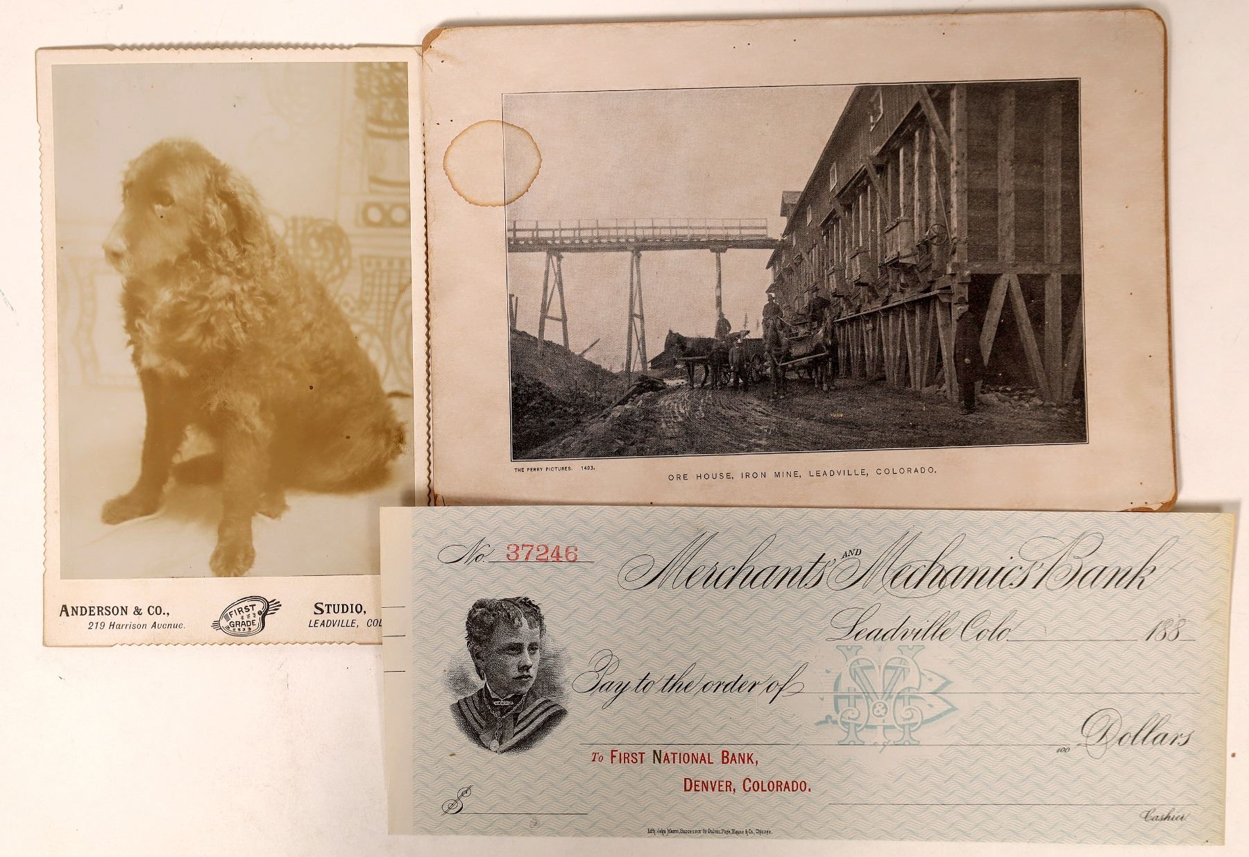 Lot of 3. 1) Cabinet card of a Leadville dog. Photo by Anderson & Co., First Grade Studio, 219 Harrison Ave., Leadville, Colorado. According to Mautz, he was at this location in 1895. 2) Boudoir card. "Ore House, Iron Mine, Leadville, Colorado." The Perry Pictures. 1403. Nice view of ore wagons with trestle in the background. This photo was done using an early mass printing process; on close inspection, it has dots. 5.5 x 8" Stain on upper left. Chips along mount. 3) Unused Merchants & Mechanics Bank check, 1880s, with vignette of Baby Doe Tabor.