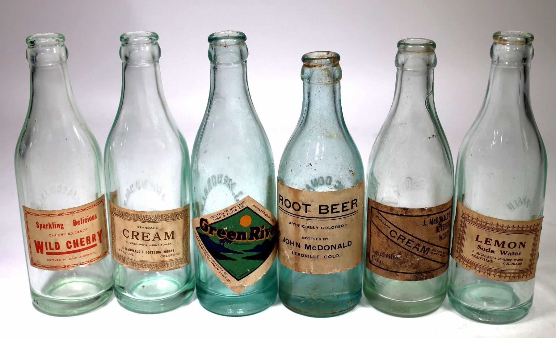 6 Leadville soda bottles with original paper labels. 2 different J. McDonald's Bottling Works/Cream. Lemon Soda Water/J. McDonald's. Sparkling Delicious/Wild Cherry/Bottled By John McDonald. Green River by Schoenhofen. Root Beer/John McDonald//J Mcdonald/Leadville.