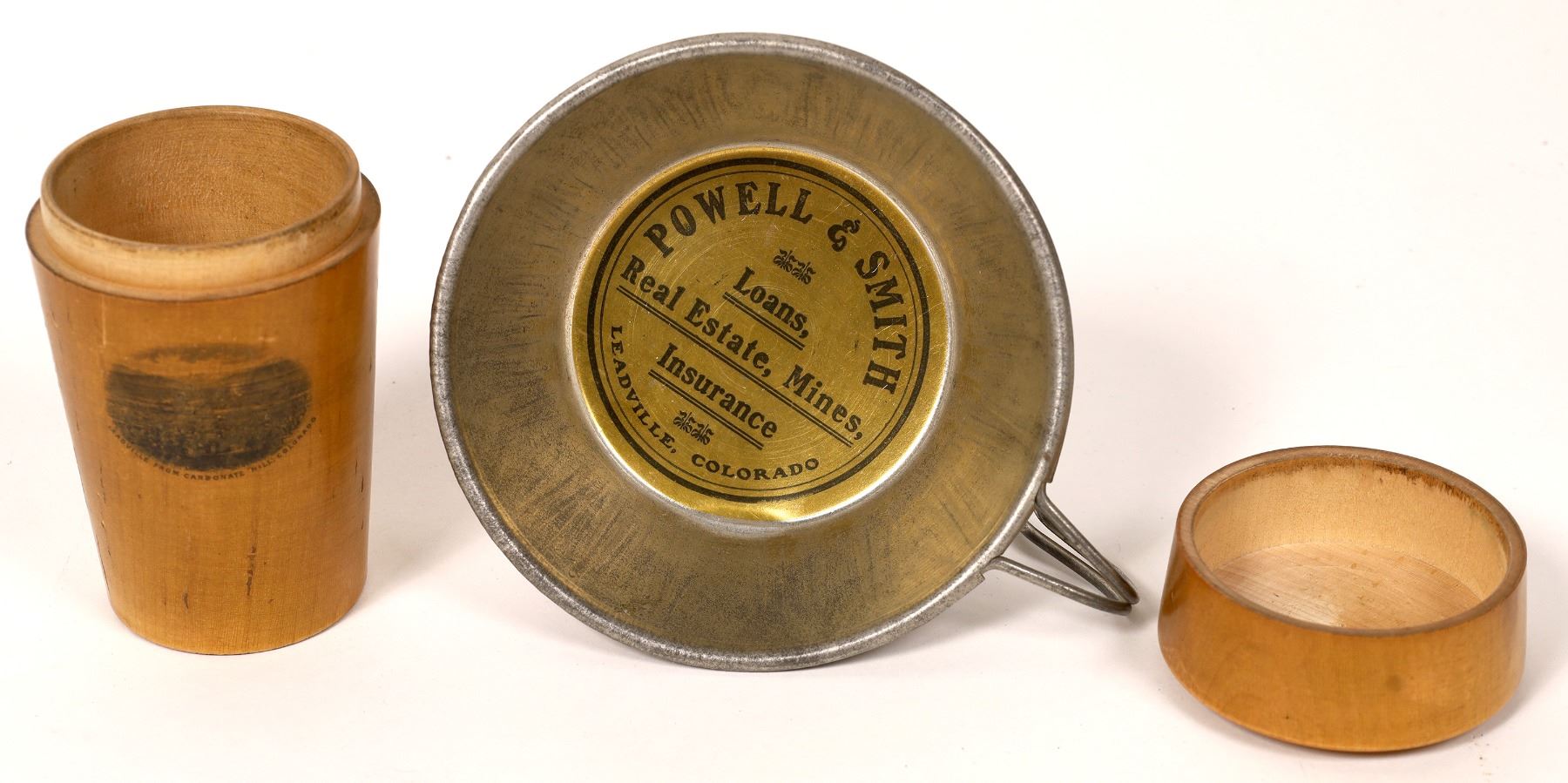 Two souvenir items from Leadville, Colorado. First we have an advertising piece, a tin drinking cup handed out as a promotional item by Powell & Smith Real Estate, Mines, Insurance.