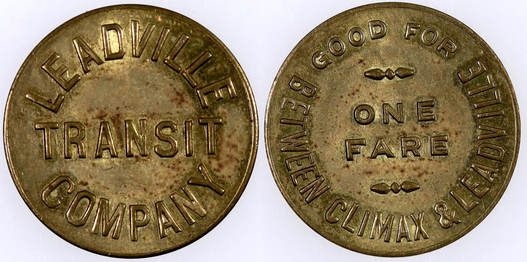 Rare transportation token: LEADVILLE / TRANSIT / COMPANY // GOOD FOR / ONE / FARE / BETWEEN CLIMAX & LEADVILLE; Br., rd., 26 mm.