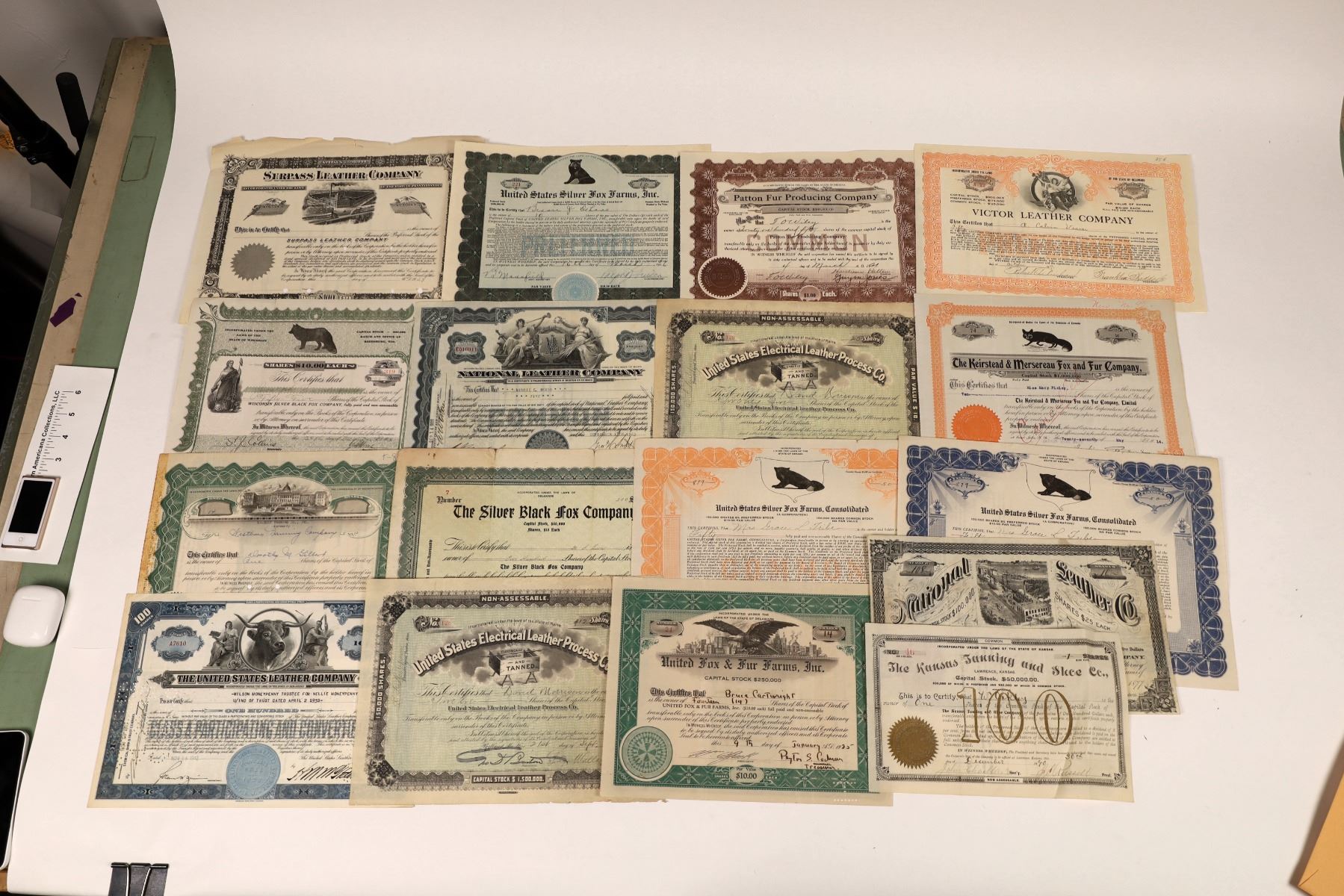 Stock certificates issued by various companies, including National Leather Company (1877), Patton Fur Producing Company (1921), Victor Leather Company (1917), Wisconsin Silver Black Fox Company (1916), Surpass Leather Company (1904), United States Electrical Leather Process Company (1898) and more. Some are blank and unissued. Please see photos fort more detail and condition.