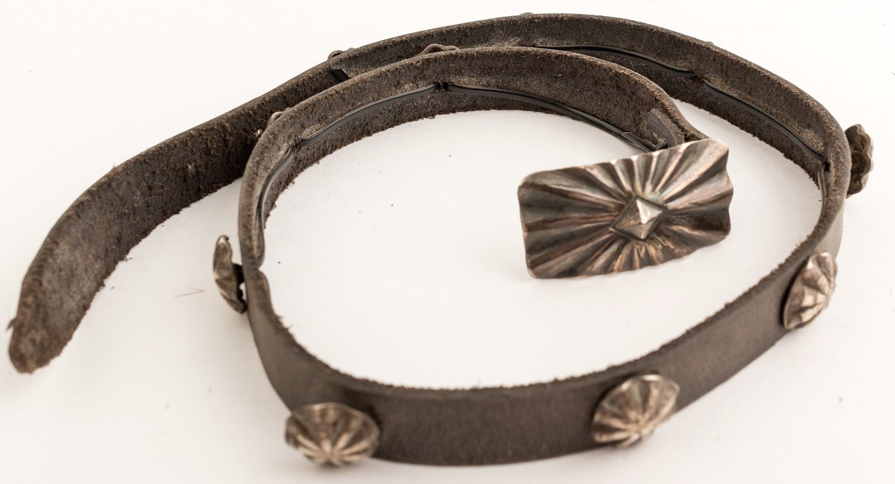 Black leather with dome shaped silver conchos. 11 conchos total. Consigned by The Cowboy Connection in Livingston, MT. State: City: Date: ID# 49861