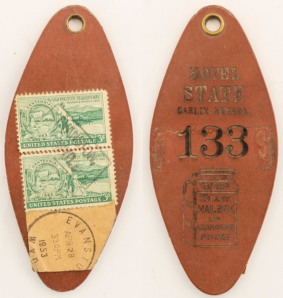 Leather key fob from Hotel State in Carlin, Nevada. Drop in any mailbox we guarantee postage. This key was actually mailed back! Reverse has two 3 cent stamps and postmark from April 28, 1953 from Evanston, WYO. City: Carlin State: Nevada Date: HWAC# 51438