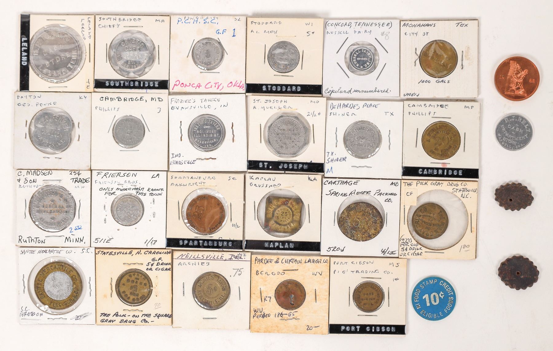 Two leather ovals (25 x 18 mm) attributed to Juan Sanchez sheep shearing of Duran, New Mexico. (listed in tokencatalog.com) Also a miscellaneous collection of over 25 tokens from around the country: Santee Mercantile bimetallic from Ferguson, South Carolina; three from Texas; Utah, Louisiana (4); Missouri, Wisconsin. Great starter collection!