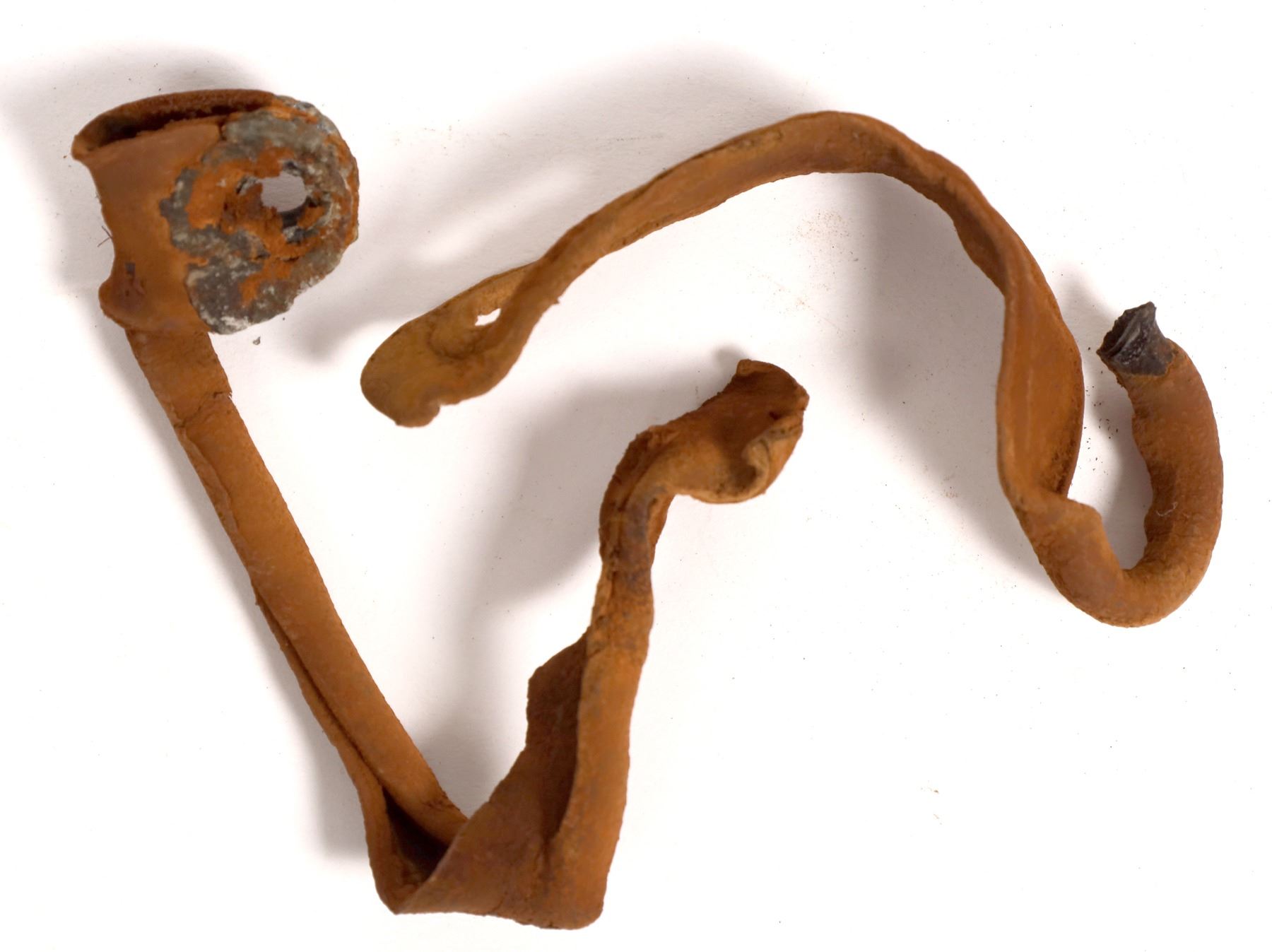 Leather Spur Straps found on the SS Central America (2). Piece one measures approximately 2.25 x .75, piece two measures approximately 2.25 x .75 inches. Simple basic straps to hold spurs on boots. The size indicated that they would belong to a lady. The spurs did not survive. Highly degraded.