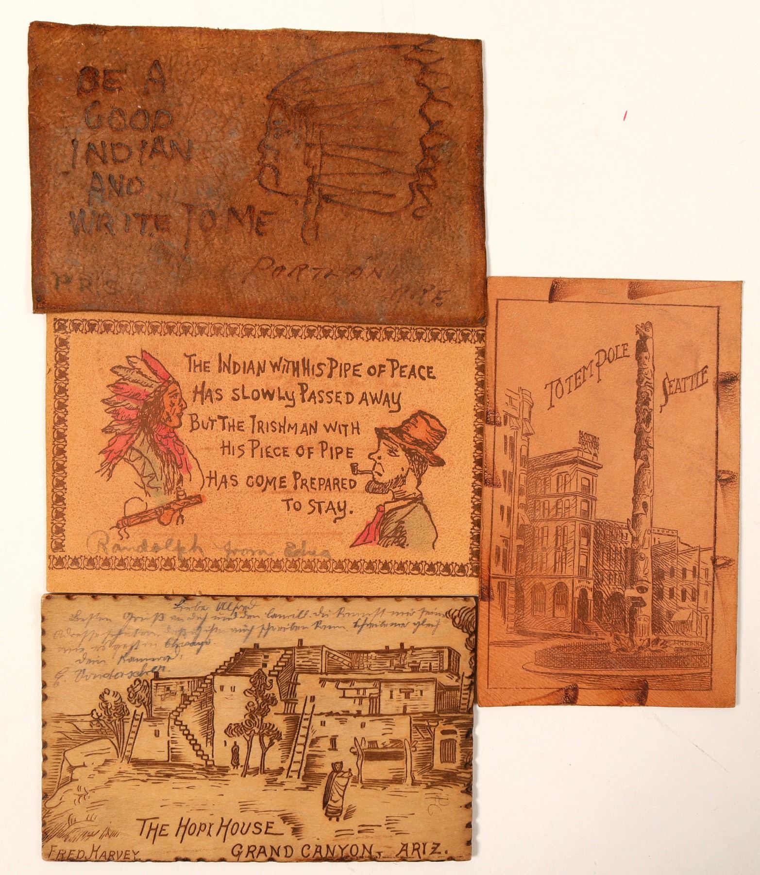 Rare! 4 leather post cards. "The Hopi House, Grand Canyon, Arizona"; "Be a good Indian and Write to Me, Portland Oregon"; Totem Pole Seattle". Salvatore Falcone Collection