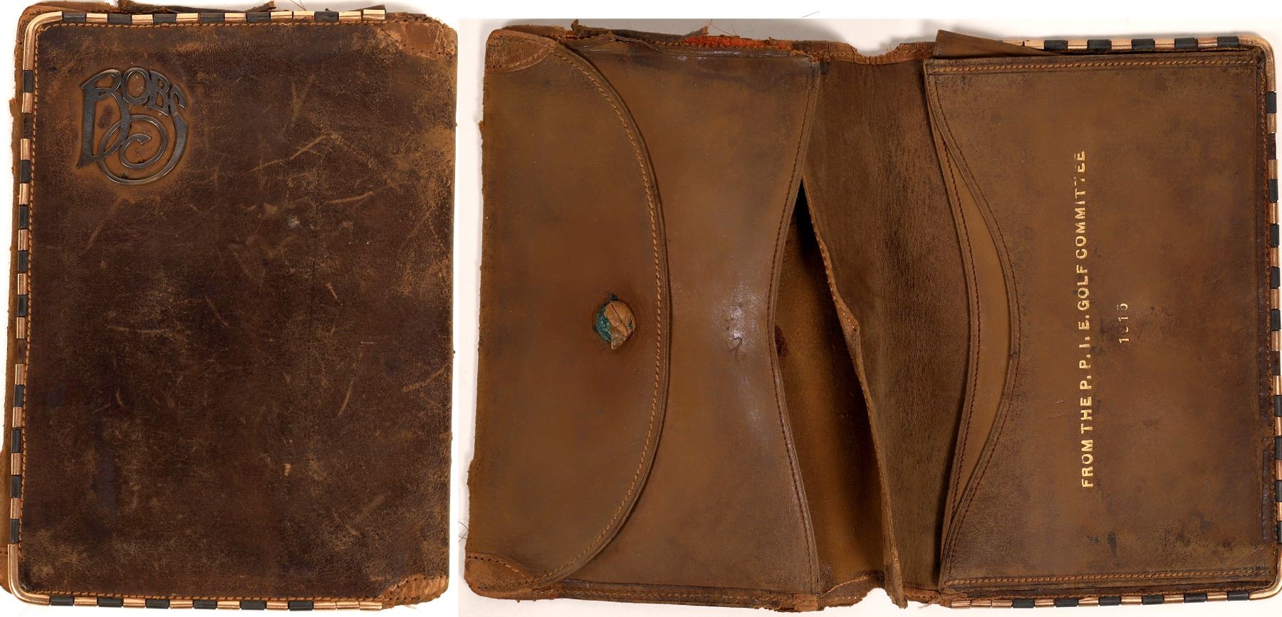 Bi-Fold stitched leather wallet w/brass trim made by Shreveport and Co. of San Francisco. Four compartment one with a button close. Metal name tag “Bobs” on outside. Shows wear, but still usable.