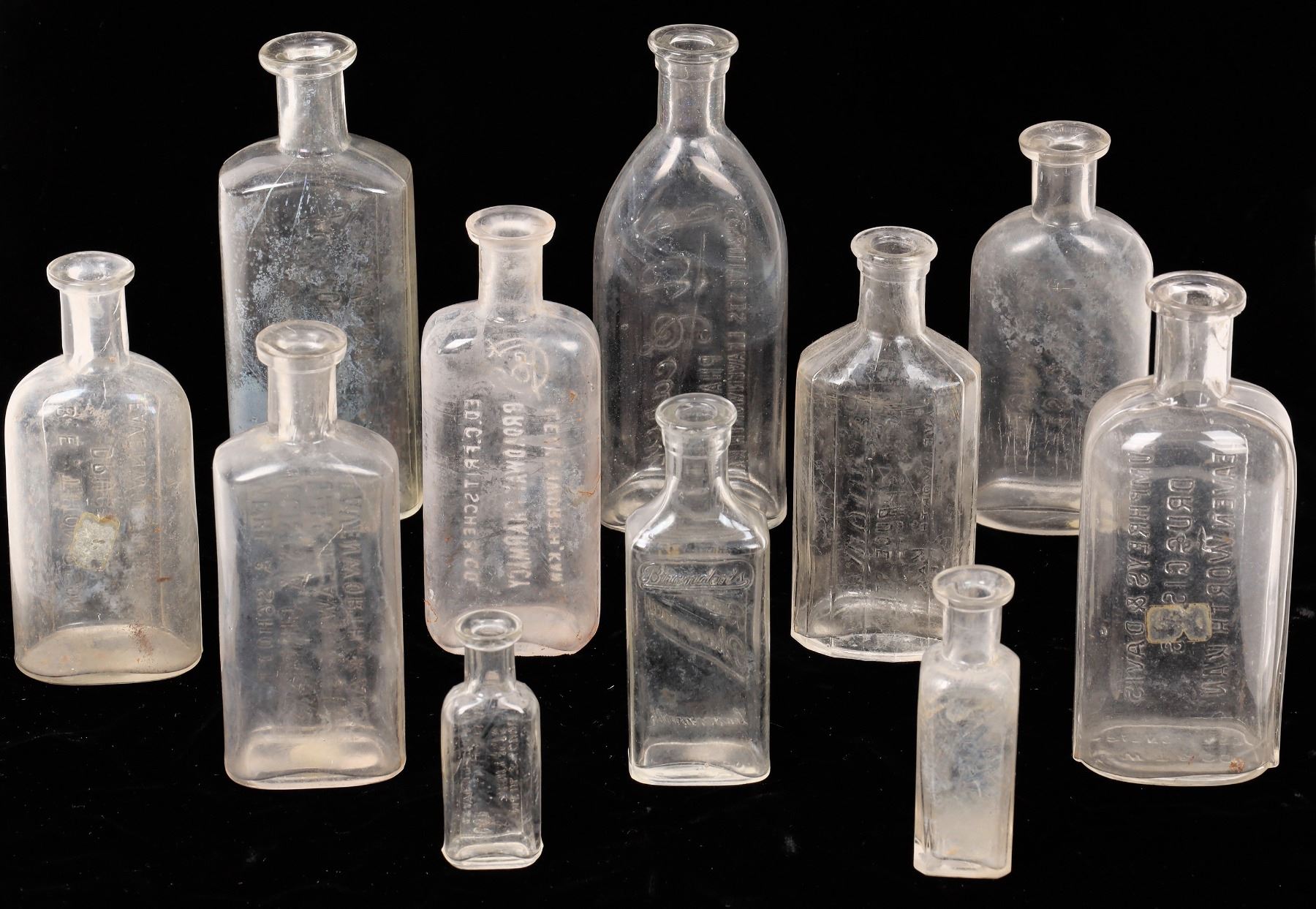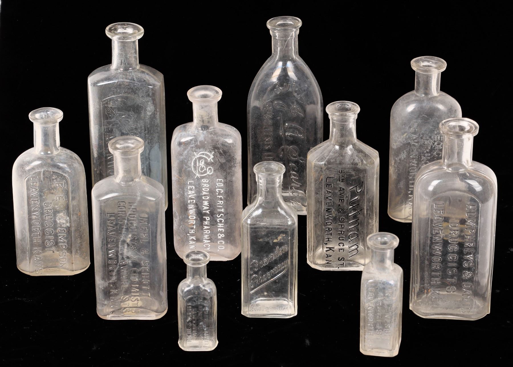 11 Leavenworth drug store bottles. Humphrey's & Davis 5.75". J Kern Pharmacists 6.25". Ed C Fritsche & Co. 5.5". Mehl & Schott 5.5" base ding. J A Seary 6.25". Geo. G Vaughan 5.25". Brandon Pharmacy 4.5". R H T Nesbitt 3.5". Putnam 5.25". B E Thompson 5". Mehl & Schott2.75". No apparent chips or cracks.