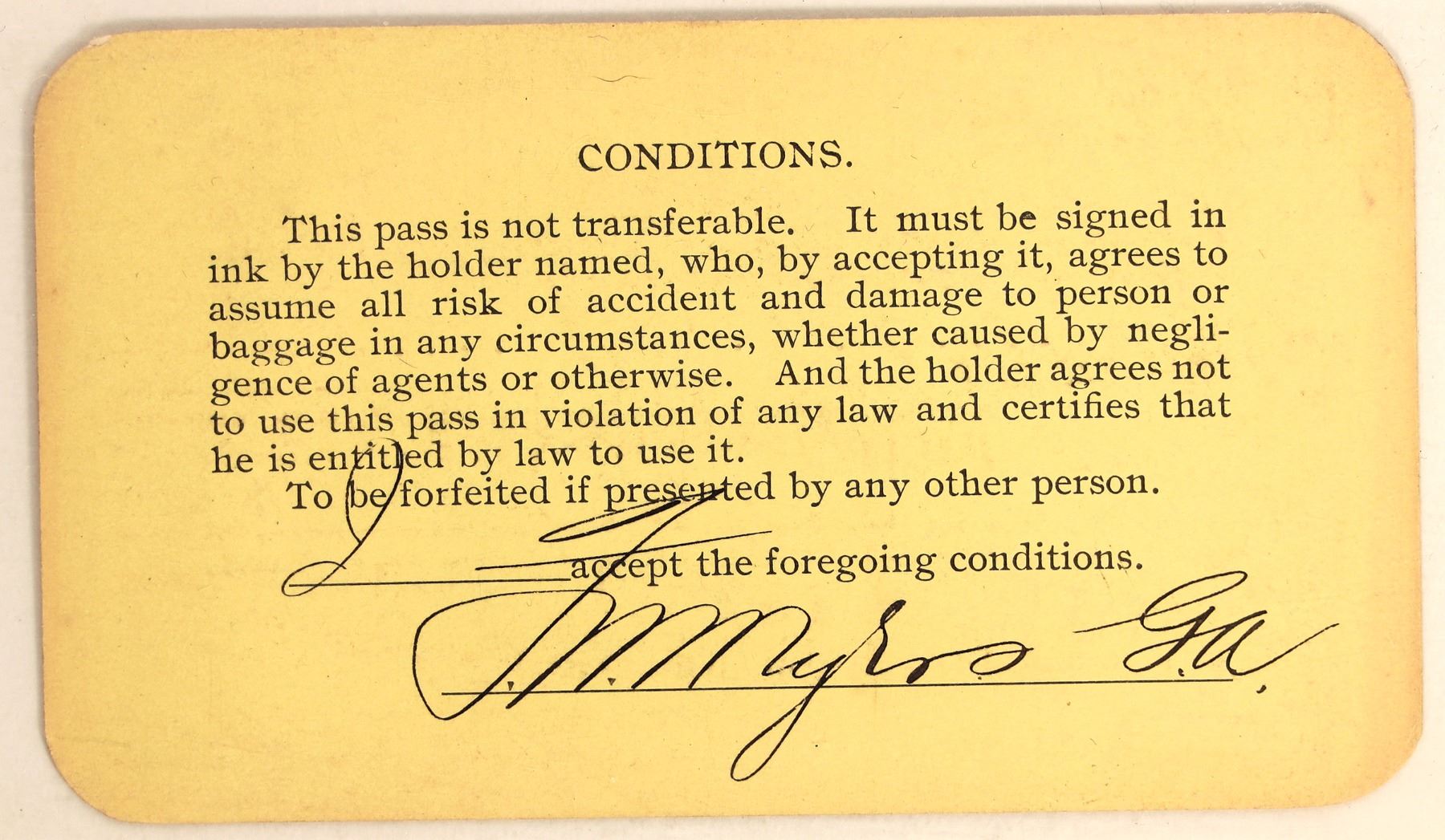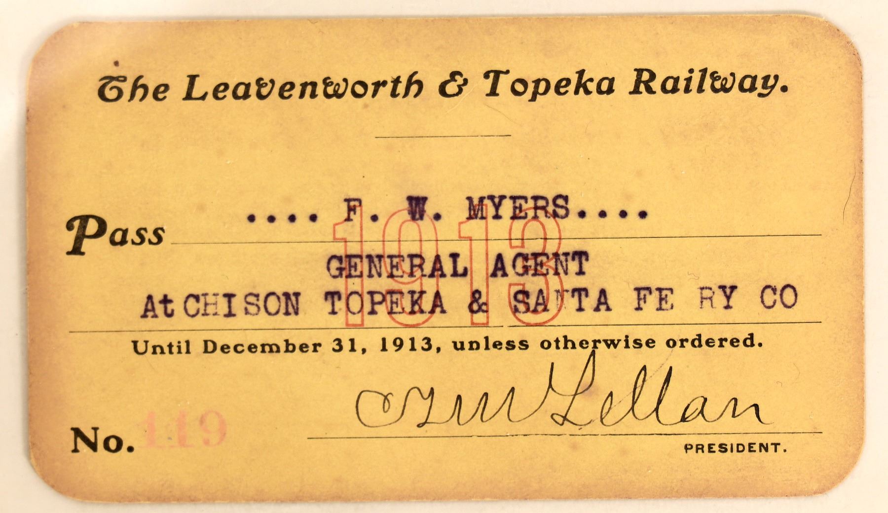 1913 Leavenworth & Topeka Railway pass, hand signed by illegible Lellan president.
