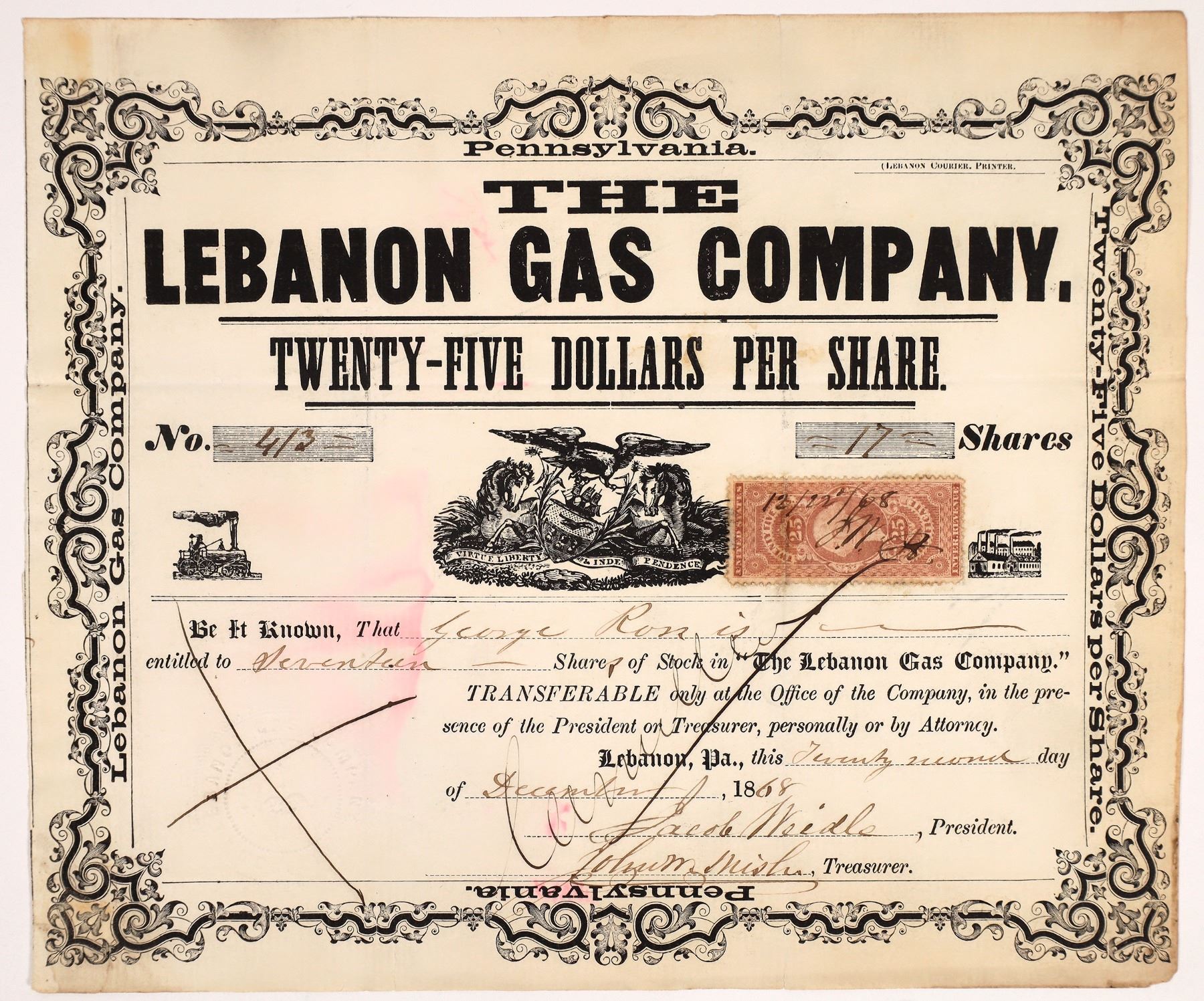 No. 413, issued to George Ron for 17 shares in Lebanon in 1868. Signed by president Jacob Weidls and the treasurer. Pen cancelled. The font and design are almost reminiscent of a broadside or even newspaper headline, with a big and bold title and interesting framing. Three vignettes: small locomotive, state seal, and factory. Printed by Lebanon Courier. 25 cent US IR certificate stamp. 8.25 x 8.5" Folds, stains.