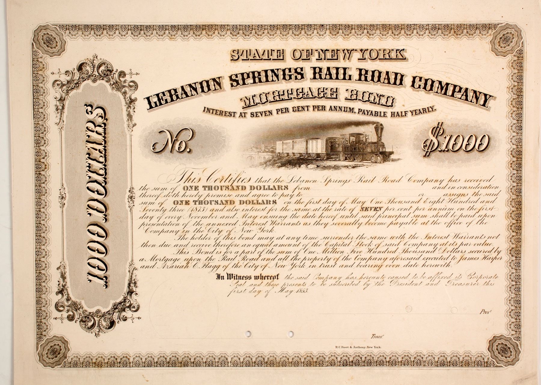 Unlisted printer's proof from proof book for $1,000 Lebanon Springs Rail Road Company mortgage bond with 7% interest from state of New York , dated May 1, 1853. Lebanon Springs Railroad completed direct route from New York to Montreal via Harlem Railroad, Lebanon Springs, Bennington, Rutland, and Burlington. Printed: R. C. Root & Anthony. N.Y. Prag collection. City: State: New York Date: