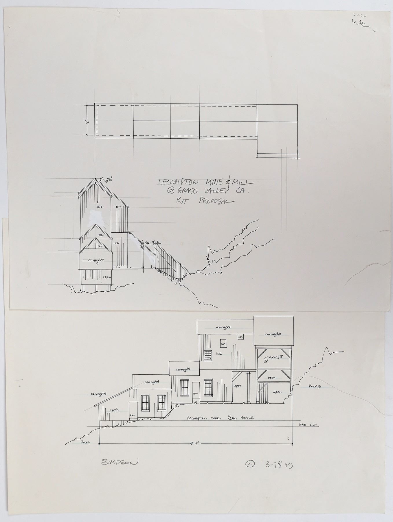 Lecompton Mine & Mill at Grass Valley, CA Kit Proposal by Simpson, 1978. The Lecompton was a famous mine with connections to George Hearst. Hearst sold his shares in this mine to invest in the Ophir Mine on the Comstock Lode. This drawing is 14.25 x 11 inches.