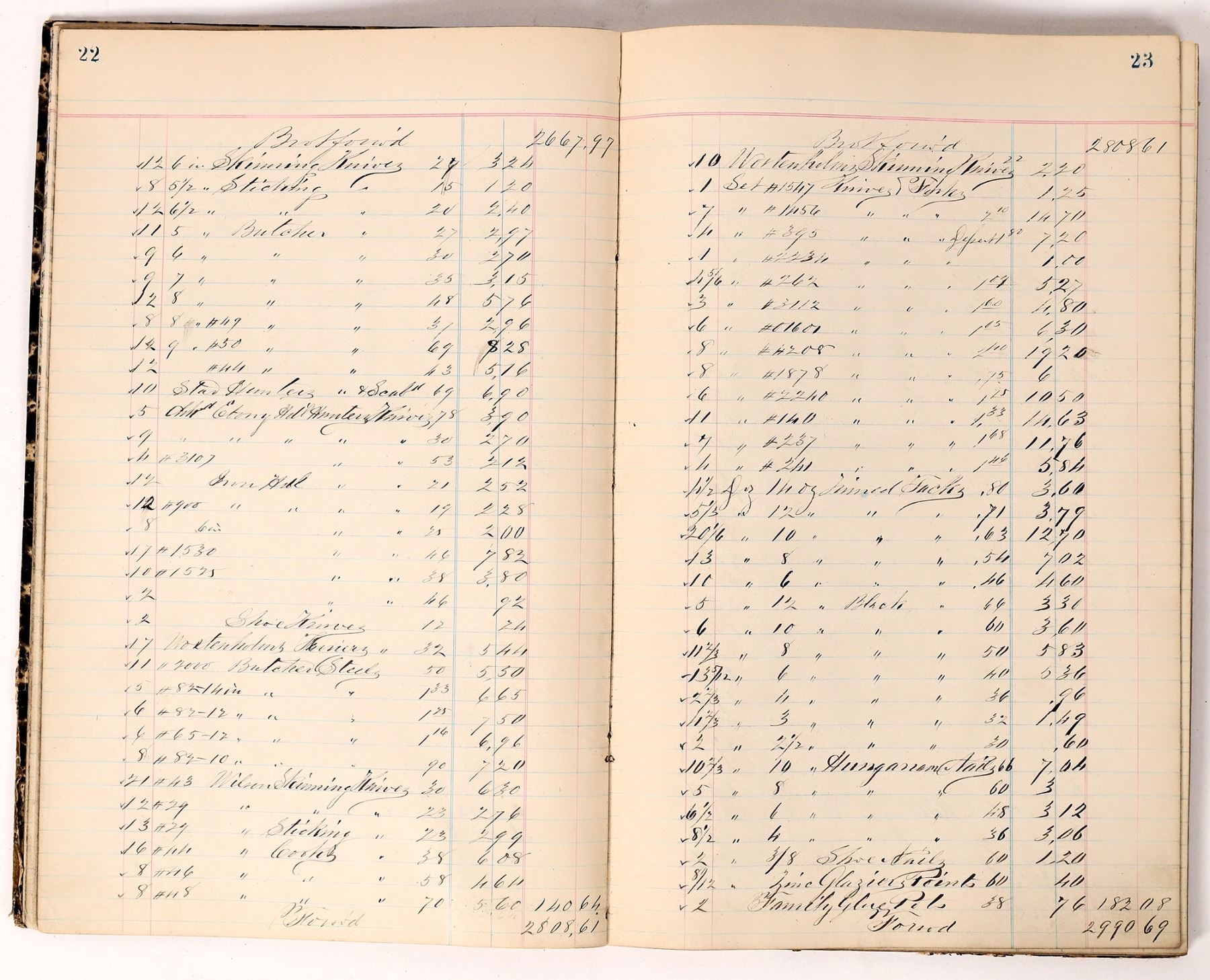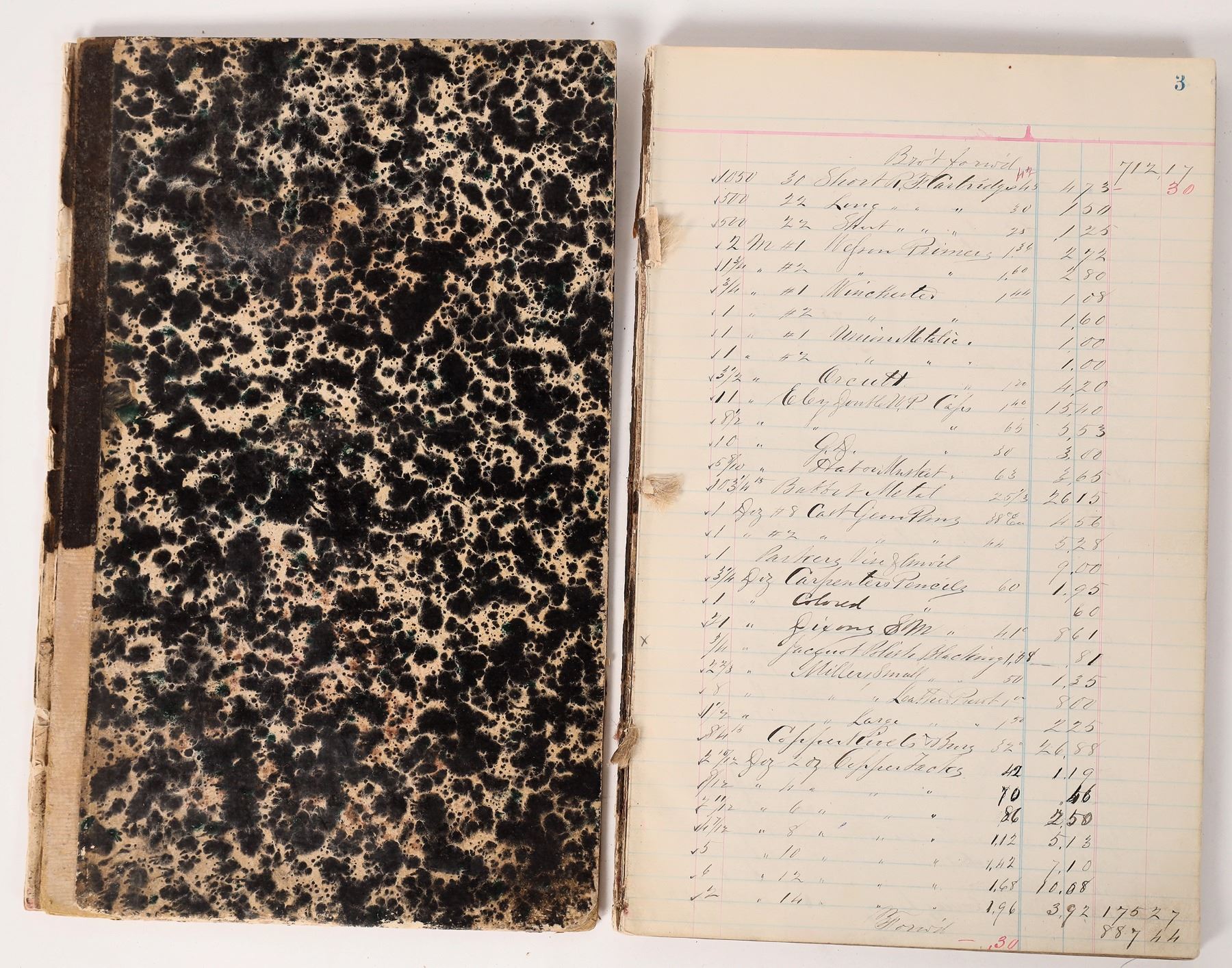 This ledger book is from the P.A. Largey & Co. hardware store in Butte, Montana c.1880. The materials sold are interesting for a frontier hardware store. The list of guns and ammunition is incredible. Got ammo. for a .44 Webley or a 45/100 Sharps? They did! 102 pages of entries. Open binding.